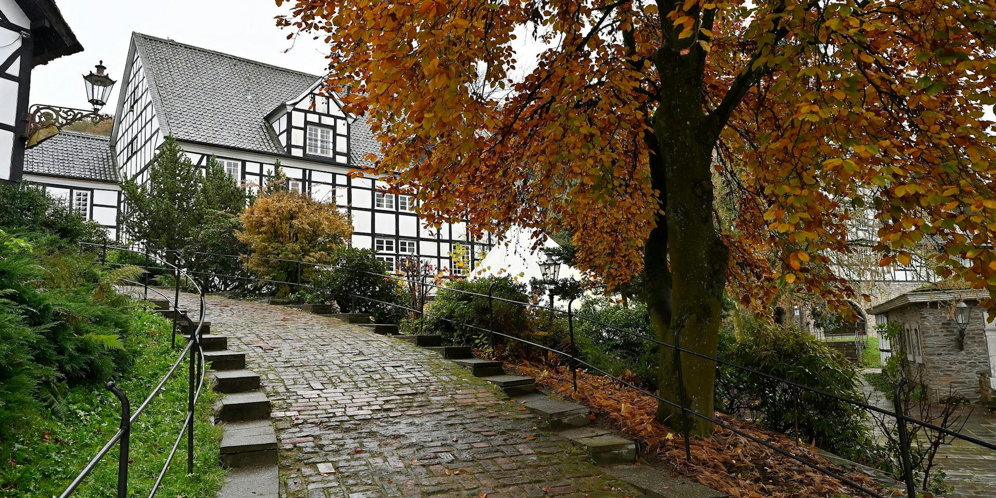 Kürten – Umrahmt von alten Bäumen mit buntem Herbstlaub haben die gepflegten historischen Fachwerkbauten einen besonderen Reiz. Das Anwesen Gut Hungenbach am Rande von Kürten ist als idyllisches Kleinod bekannt. Zufrieden blickt Dr. Astrid Hencke auf die Gebäude, erinnert sich an Momente der bewegten Vergangenheit von Hungenbach.