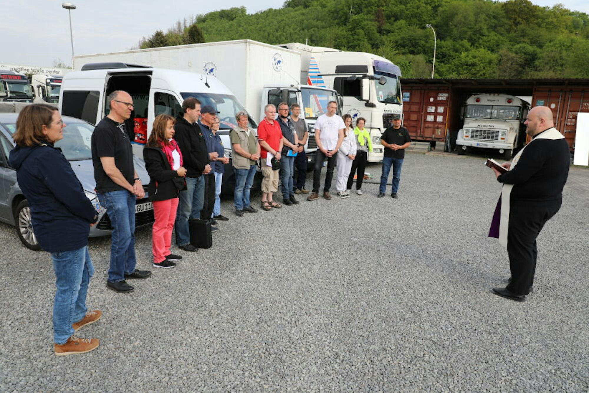 Vor der Abfahrt gibt der Overather Kaplan Andrzej Bednarz (r.) den Hilfstransporteuren den Reisesegen.