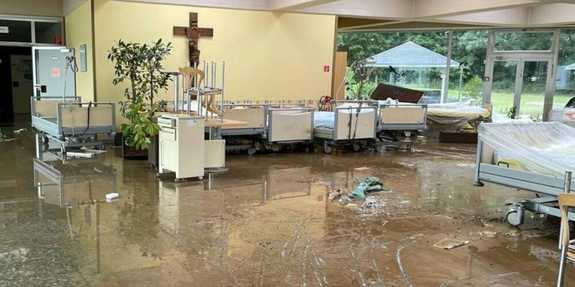 Am 15. Juli war die Flutwelle durch die Klinik gerollt, das Erdgeschoss hatte unter Wasser gestanden. Patienten waren unter dramatischen Umständen gerettet worden. Für viele sehr teure medizinische Geräte hatte es aber keine Rettung gegeben, am Tag nach der Katastrophe bot sich ein Bild der Zerstörung, mit zerplatzen Scheiben, schlammbedeckten Fluren und verwüsteten Zimmern.