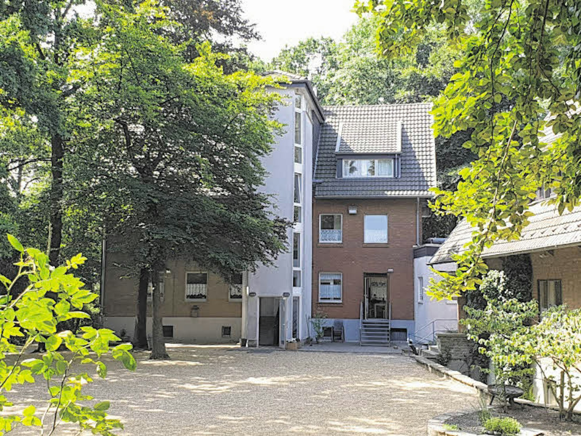 Idyllisch inmitten von Bäumen liegt das Villehaus. Das Treppenhaus musste vor 20 Jahren aus Brandschutzgründen angebaut werden.