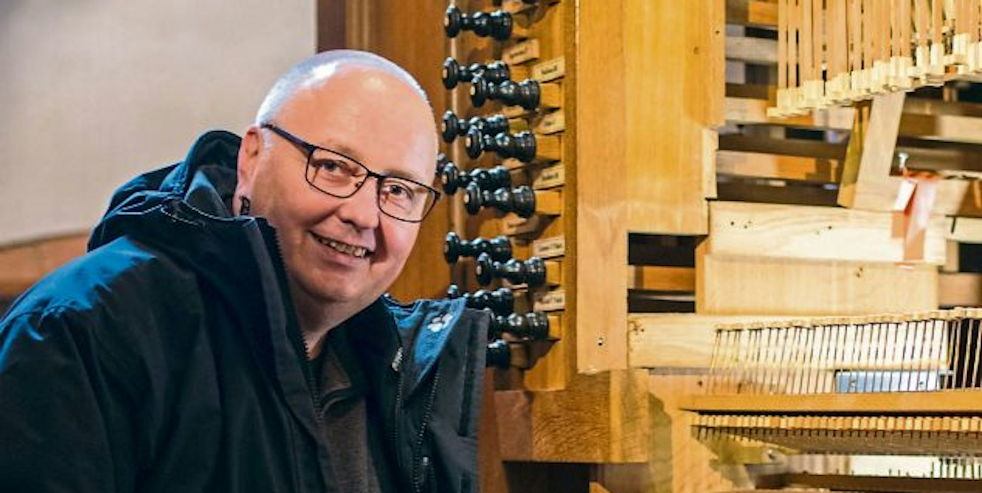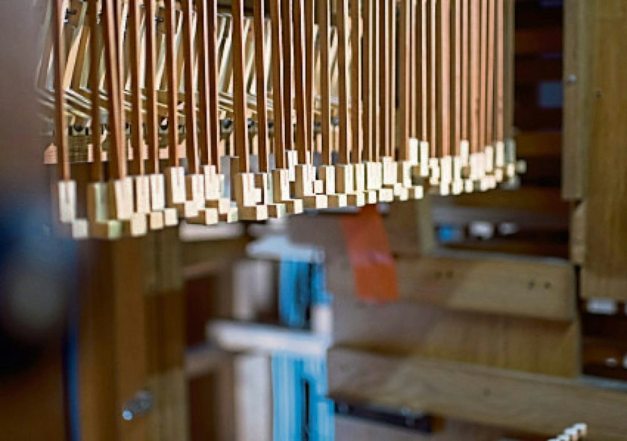 An der Stirnseite, wo sich sonst die drei Manuale mit den Tasten befinden, waren im Zuge der Überarbeitung lauter filigrane Holz-Stangen sichtbar. „Das sind unter anderem die Verbindungen, womit die Pfeifen über die drei Manuale und das Pedal angesteuert werden“, erklärt Michael Pützer, Organist sowie Kirchenmusiker der Gemeinschaft der Gemeinden Heiliger Hermann-Josef.