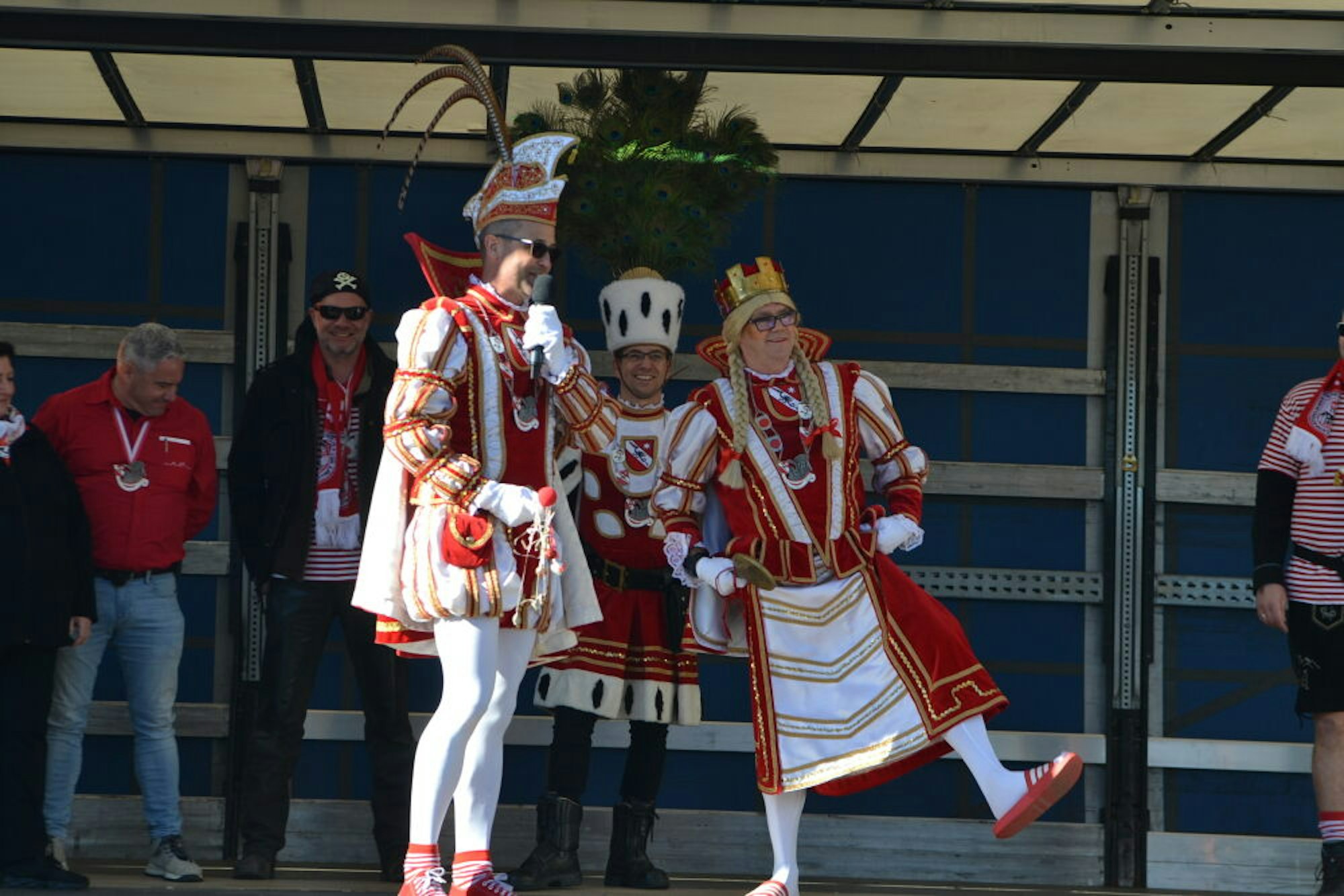 Euskirchen-Palmersheim – „Bei meiner Proklamation hätte ich mir nicht träumen lassen, dass ich heute schon die dritte Session als Prinz mit euch feiern kann“, erklärte Prinz Martin II. (Königshoven), während er die Jecken vor dem Palmersheimer Dorfgemeinschaftshaus willkommen hieß. Zwar sei das Zepter der Flut zum Opfer gefallen und auch Jungfrau Dirklinde (Dirk Dietrich) hatte das Schuhwerk durch Adiletten ersetzen müssen: An der Freude Karneval zu feiern, habe dies aber nichts geändert.