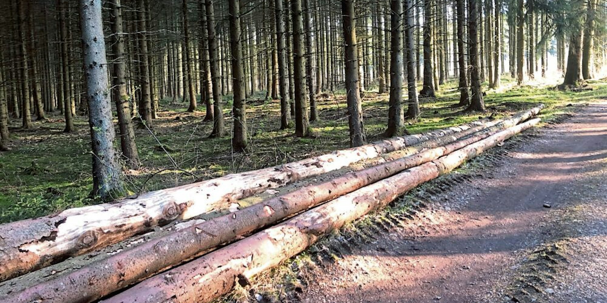 Käferholz liegt am Waldweg zum Abtransport bereit. Glücklicherweise sind die Borkenkäfer in diesem Jahr noch nicht aktiv.