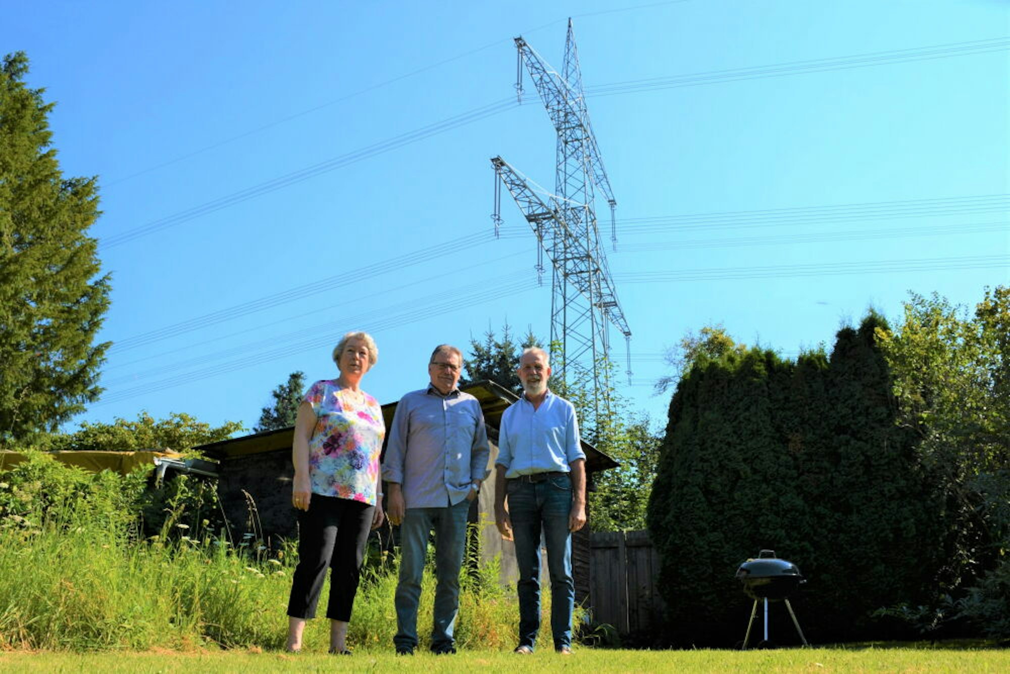 Hinter dem Haus von Rose-Marie Hoeksema-Dahlhoff in Meschenich verläuft die bestehende 110-Kilovolt-Leitung. Ein kurzer Besuch im Garten ergibt: Die Leitung knistert. Als würde man mit sehr feinem Papier eine Holzplatte abschmirgeln. Die Meschenicherin befürchtet, dass die Geräuschbelästigung demnächst noch zunehmen könnte. Denn auf die bestehenden Masten sollen bis 2026 weitere Leitungen aufgesetzt werden, mit denen als Pilotprojekt „Ultranet“ neben der üblichen Wechselspannung auch noch Gleichspannung über weite Strecken hinweg transportiert werden kann. „Wir wehren uns gegen eine noch nicht erprobte Höchstspannungs-Hybridleitung mit 96 dicken Leiterseilen direkt über unseren Hausgärten“, so Hoeksema-Dahlhoff.