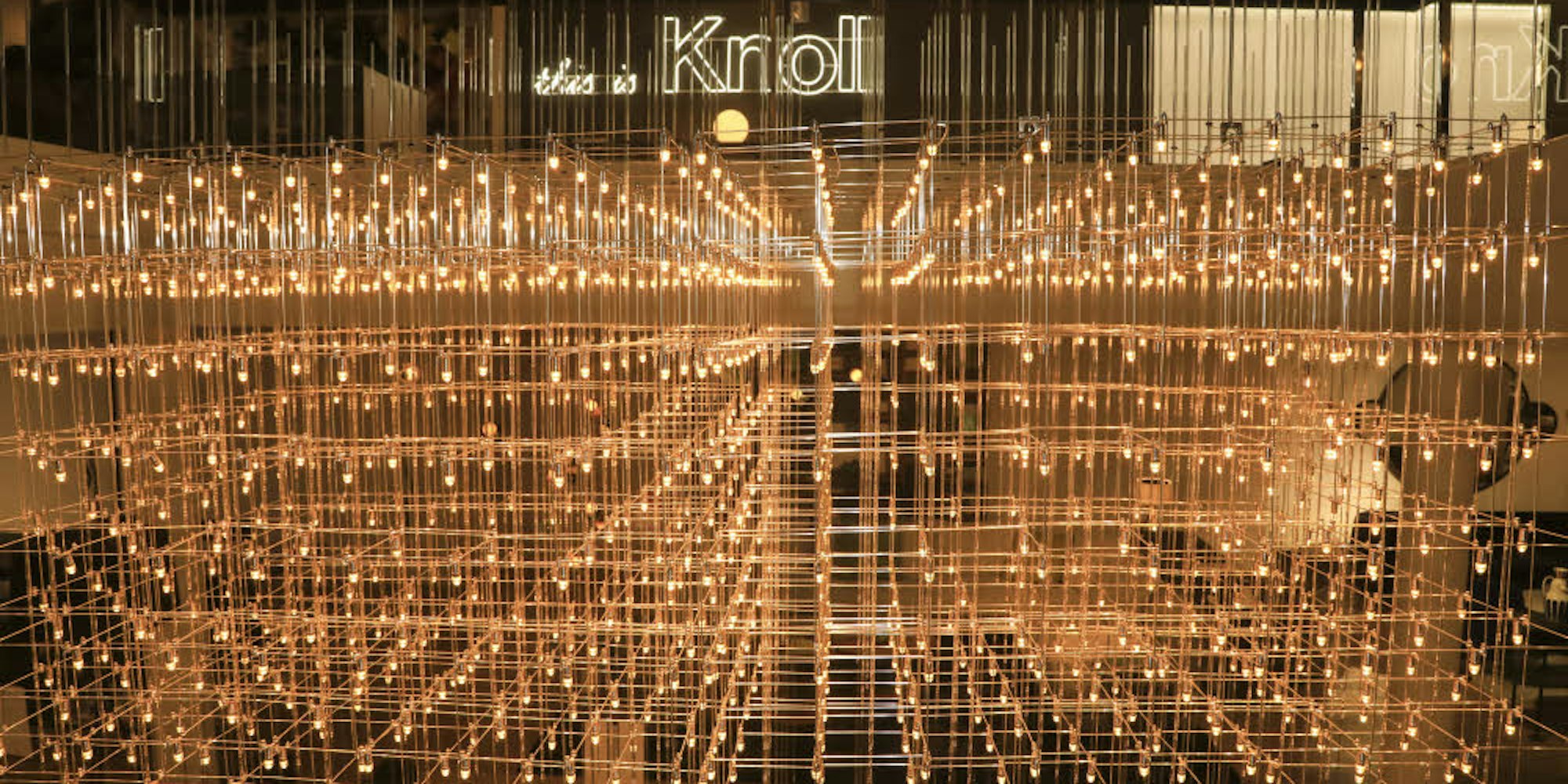 1100 kleine Leuchtmittel stecken in diesem zwei Kubikmeter großen Metall-Lüster – zu sehen bei Pesch.