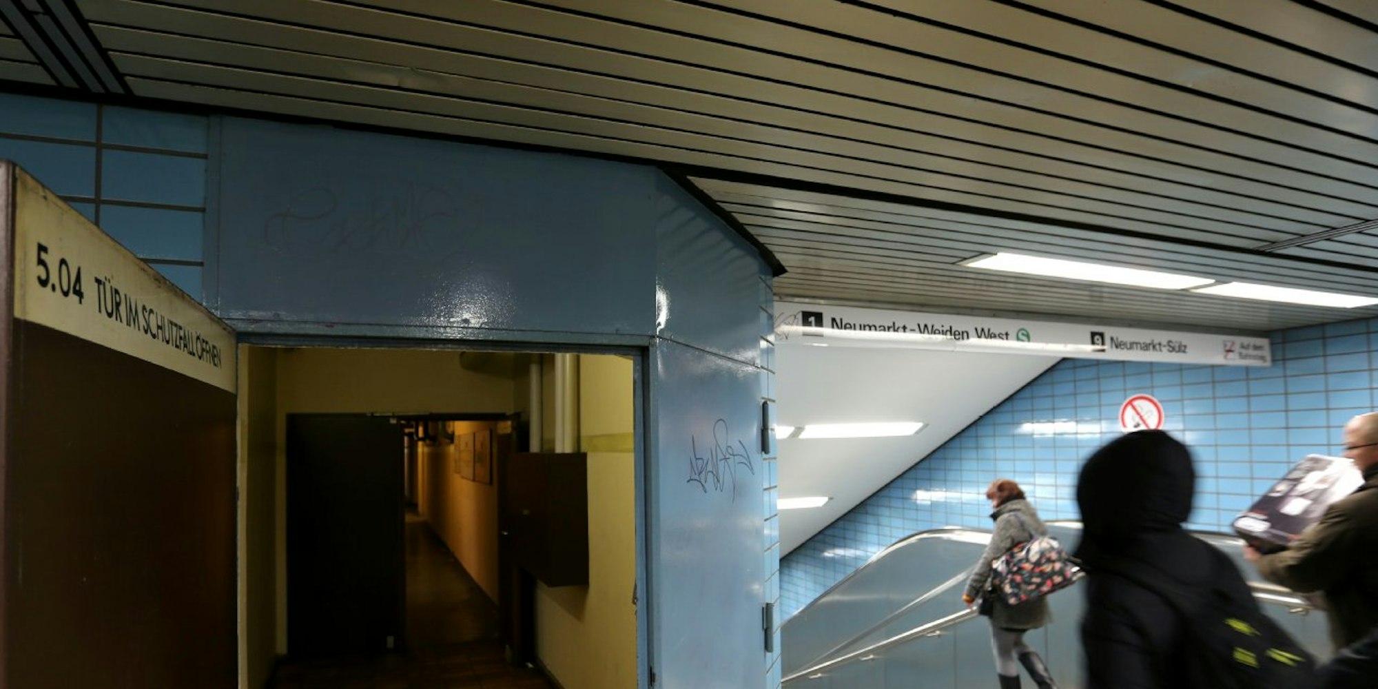Fahrgäste hasten zum Bahnsteig in der U-Bahn-Station Kalk Post. Dass die Tür links zu einem Bunker führt, dürften wohl die wenigsten wissen.