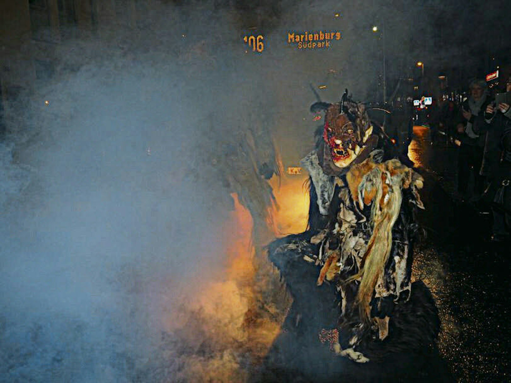 Die Perchten, gruselige Gestalten aus den Bergen, waren mitten in Bayenthal unterwegs.
