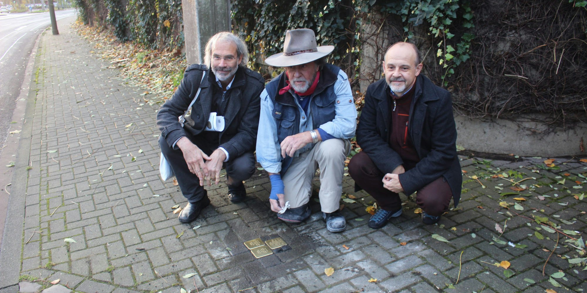 Stolperstein-Verleger Gunter Demnig (Mitte) mit Archivar Reinhold Kruse (l.) und Karl-Heinz Kubatschka vom Alpenverein Köln (r.)