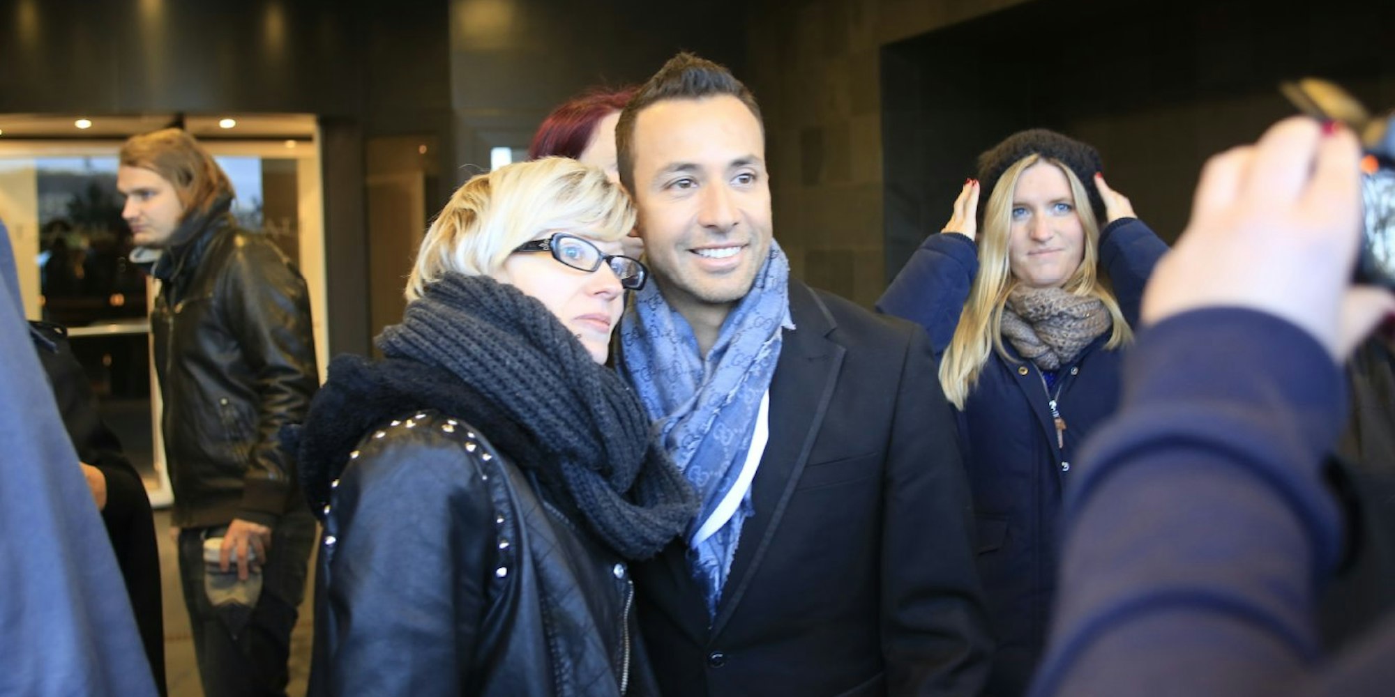 Dieser Fan hat Glück. Sie ergattert vor dem Hyatt Hotel ein Foto mit Backstreet-Boy Howie Dorough.