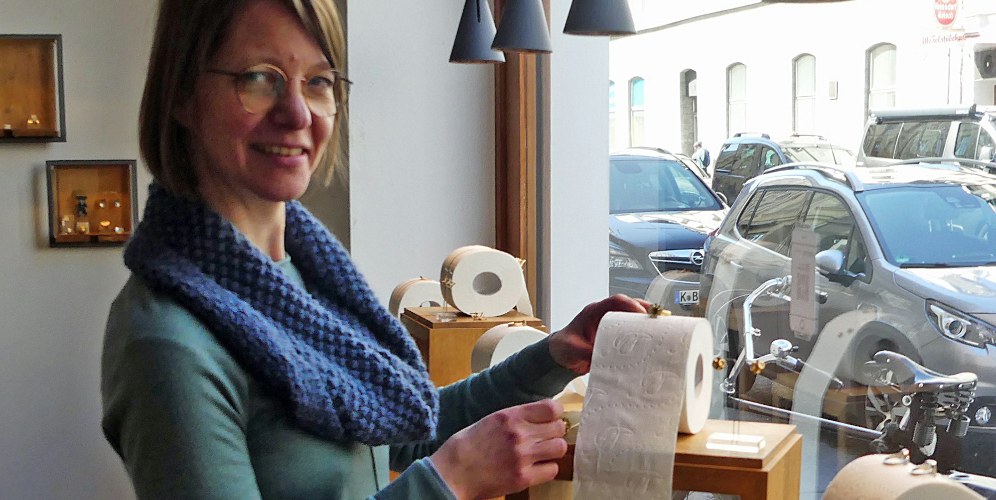 Die Idee lag nahe, doch darauf kommen musste man erst einmal. Für Jutta Grote kam der Anstoß, als ihr Menschen mit mehreren Packungen Toilettenpapier auf dem Arm begegneten. Mit ihrer Dekoration wollte sie aber keinesfalls die bisweilen etwas bizarr anmutende Gier nach dem mehrlagigen Zellstoff-Krepp veräppeln. Lediglich ein wenig Freude wolle sie bereiten. Wenn sie in ihrem Atelier arbeitet, kann sie sehen, wie die Passanten schmunzelnd weitergehen. Das bestätigt sie und ihre Idee.