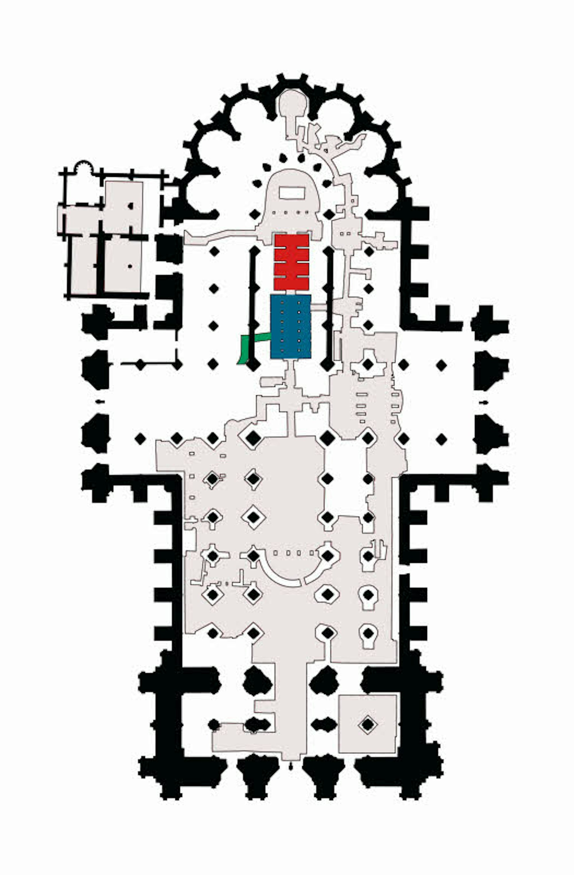 Grundriss des Kölner Doms: Rot eingezeichnet ist der Standort der Gruft, blau der Krypta, grün der Zugang zur Krypta.
