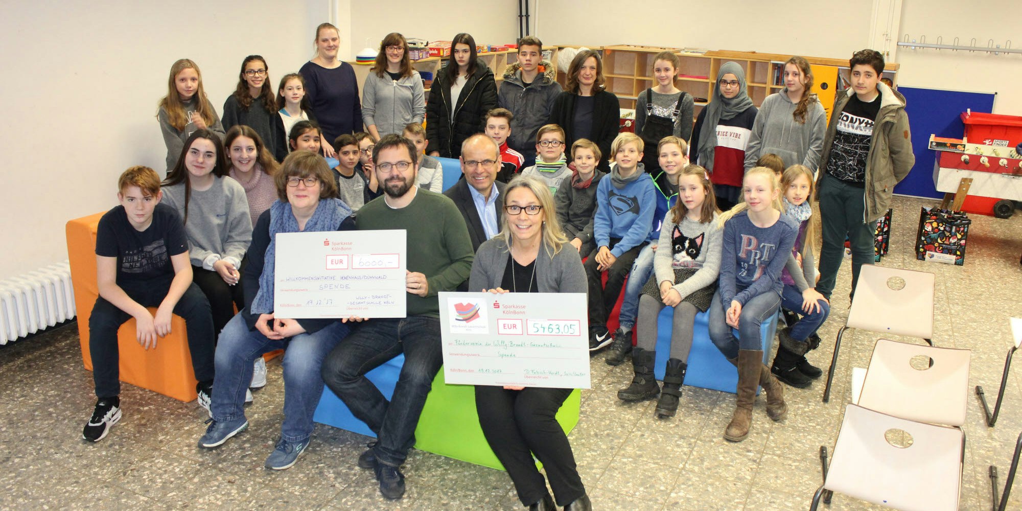 Dellbrück/Höhenhaus – Ein Rekordergebnis kam beim Spendenlauf der Willy-Brandt-Gesamtschule (WBG) zusammen. Die Teilnehmer erliefen insgesamt 11 463,05 Euro. Vor wenigen Tagen wurde das Geld am Teilstandort Dellbrück der Gesamtschule symbolisch je zur Hälfte an die Willkommensinitiative Höhenhaus-Dünnwald und an den Förderverein der Gesamtschule überreicht. Gleichzeitig wurden die besten Spendenläufer mit Urkunden und kleinen Geschenken geehrt.