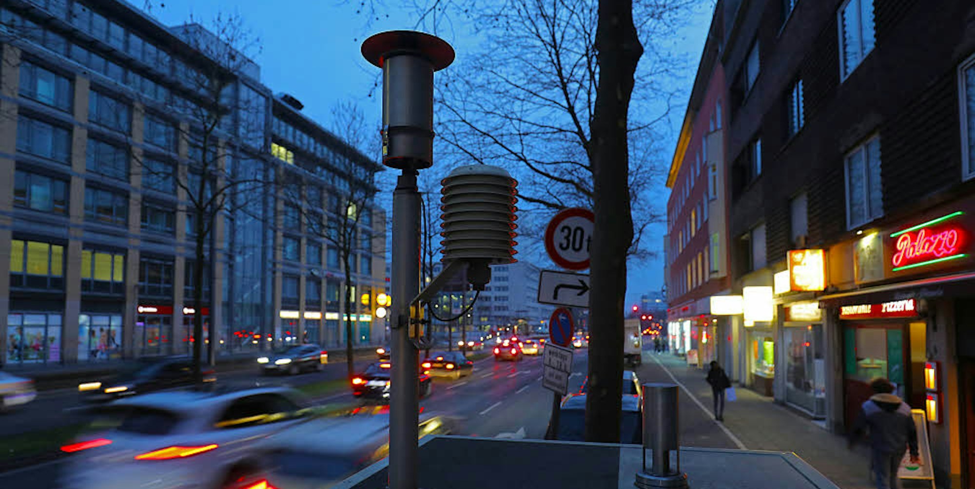 Die Feinstaub-Messanlage am Clevischen Ring in Mülheim steht unmittelbar neben der viel befahrenen Straße.