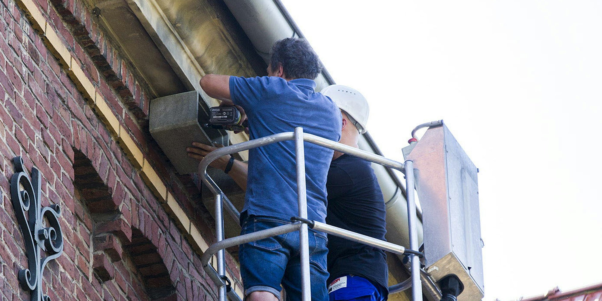 Nippes – Wohnungsnot bei Kölns Mauerseglern. Mit einer Offensive zum Schutz der pfeilschnellen Zugvögel, die mit ihren Sichelflügeln und dem gegabelten Schwanz Schwalben zum Verwechseln ähnlich sehen, startete die städtische Gebäudewirtschaft mit dem Naturschutzbund Deutschland (Nabu) eine Aktion, um den Tieren geeignete Brutplätze bereitzustellen. An der Nippeser Förderschule für Emotionale und Soziale Entwicklung in der Auguststraße brachte die Stadt jetzt zwei Nistkästen für Mauersegler an, nachdem sie zuvor zwei Nisthilfen an einem städtischen Gebäude in der Liebigstraße in Ehrenfeld installiert hatte. Mit dicken Dübeln und stabilen Schrauben befestigten Michael Igler und Oliver Tonkel von der Werkstatt der Gebäudewirtschaft das etwa sieben Kilogramm schwere Mauersegler-Ersatzquartier aus Holzfaserbeton in rund 13 Metern Höhe unterhalb der Dachrinne des Schulgebäudes.
