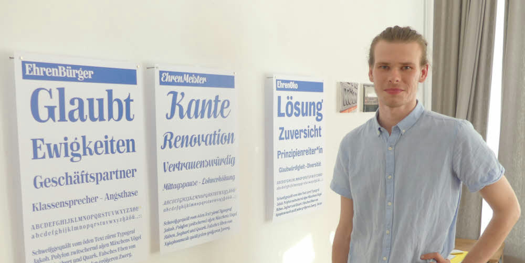 Am Computer mit Hilfe eines Programms zur Schriftgestaltung verbrachte der 25-Jährige die vergangenen Monate. Jeder einzelne Buchstabe muss pixelgenau ausgearbeitet werden.Jede einzelne Schrift aus der Sippe trägt einen anderen Namen: EhrenWerk, EhrenBürger, EhrenÖko, EhrenEck, EhrenSzene, EhrenBude und EhrenMeister.