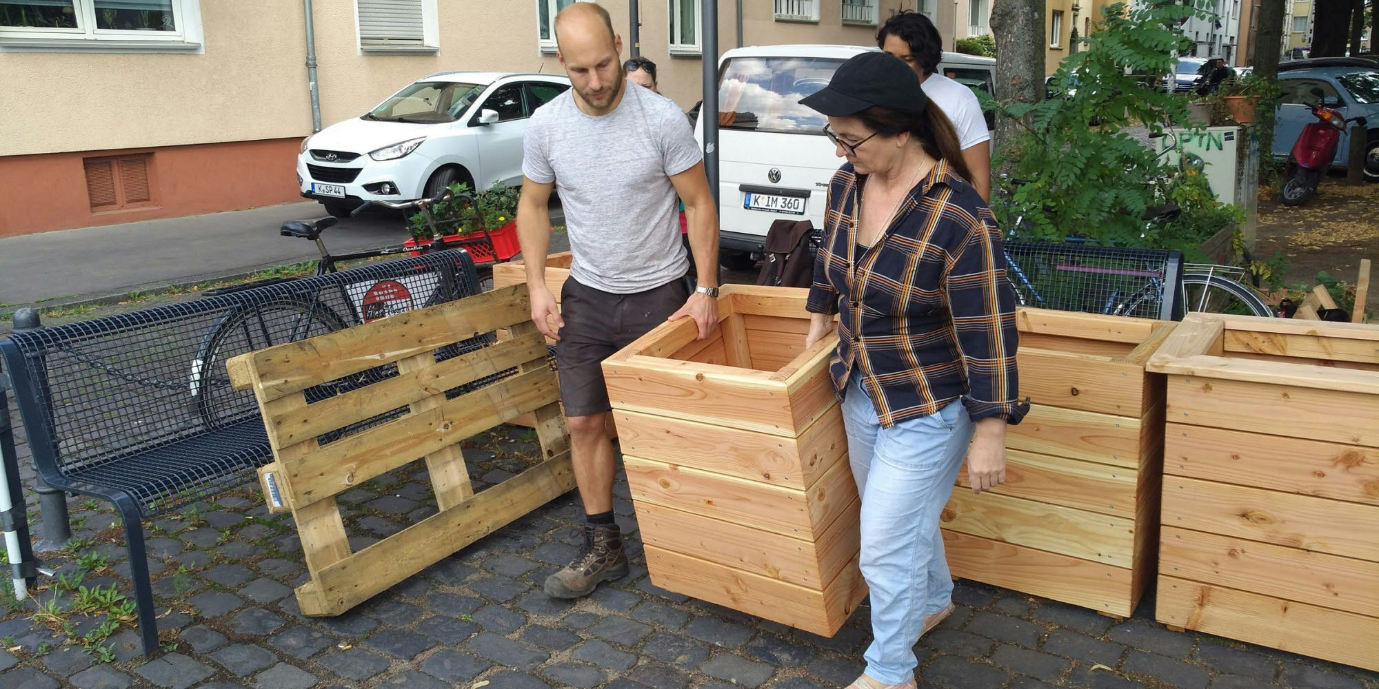 Sülz – Die neue Holzbank ließ eine halbe Stunde auf sich warten, aber sie kam. Und sie war nicht einmal fertig, da saßen Sabine Guerra-Meine und ihre Tochter Cecilia auch schon darauf. Sie kamen zum Büdchen am Nikolausplatz, um beim Aufstellen der Bank und der Pflanzkübel mitanzupacken. Sabine Guerra-Meine bot an, Erde und Pflanzenvlies aus dem Baumarkt zu holen.