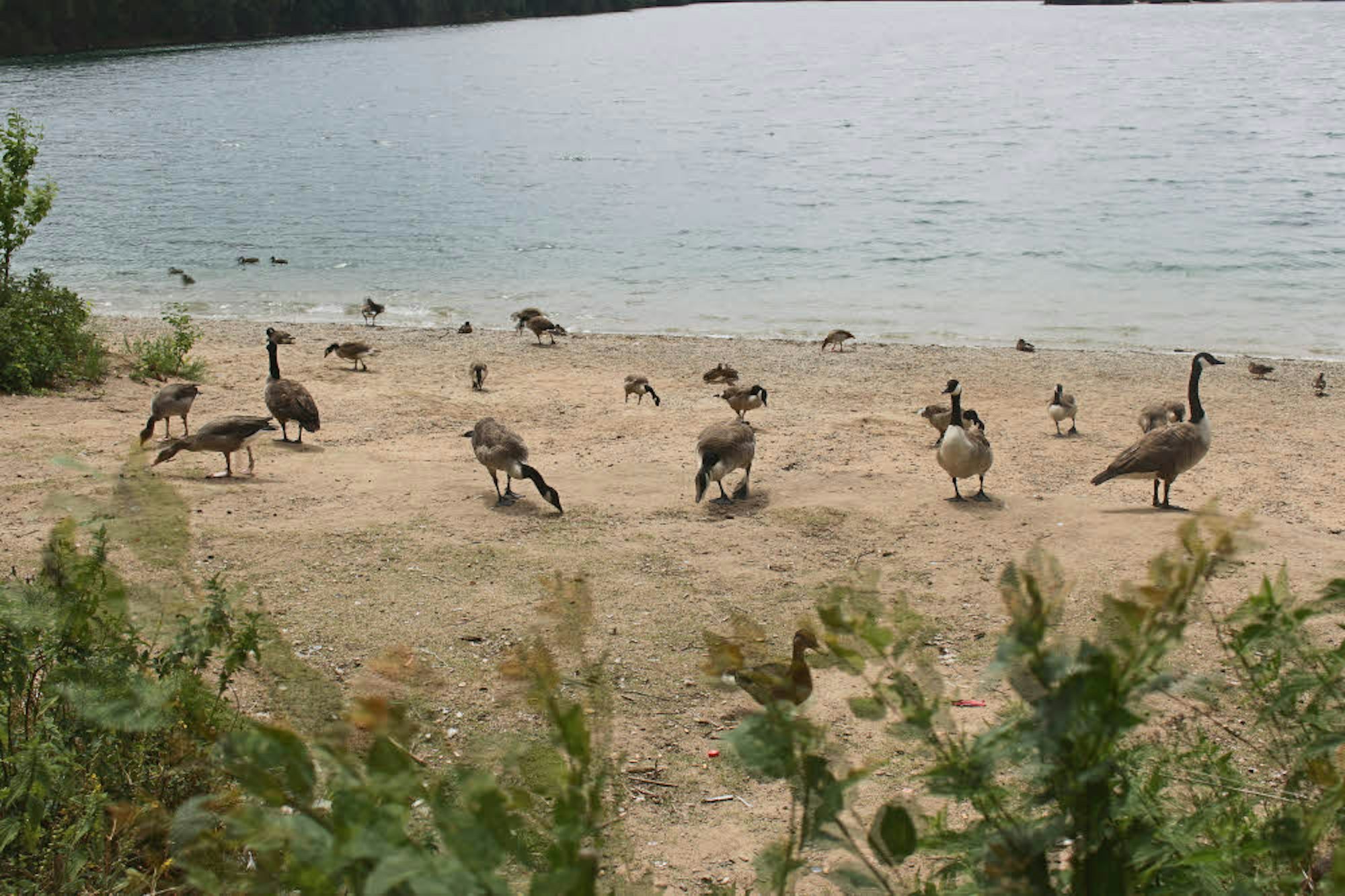 Eine Gänse-Schar am kleinen Strand des Pescher Sees