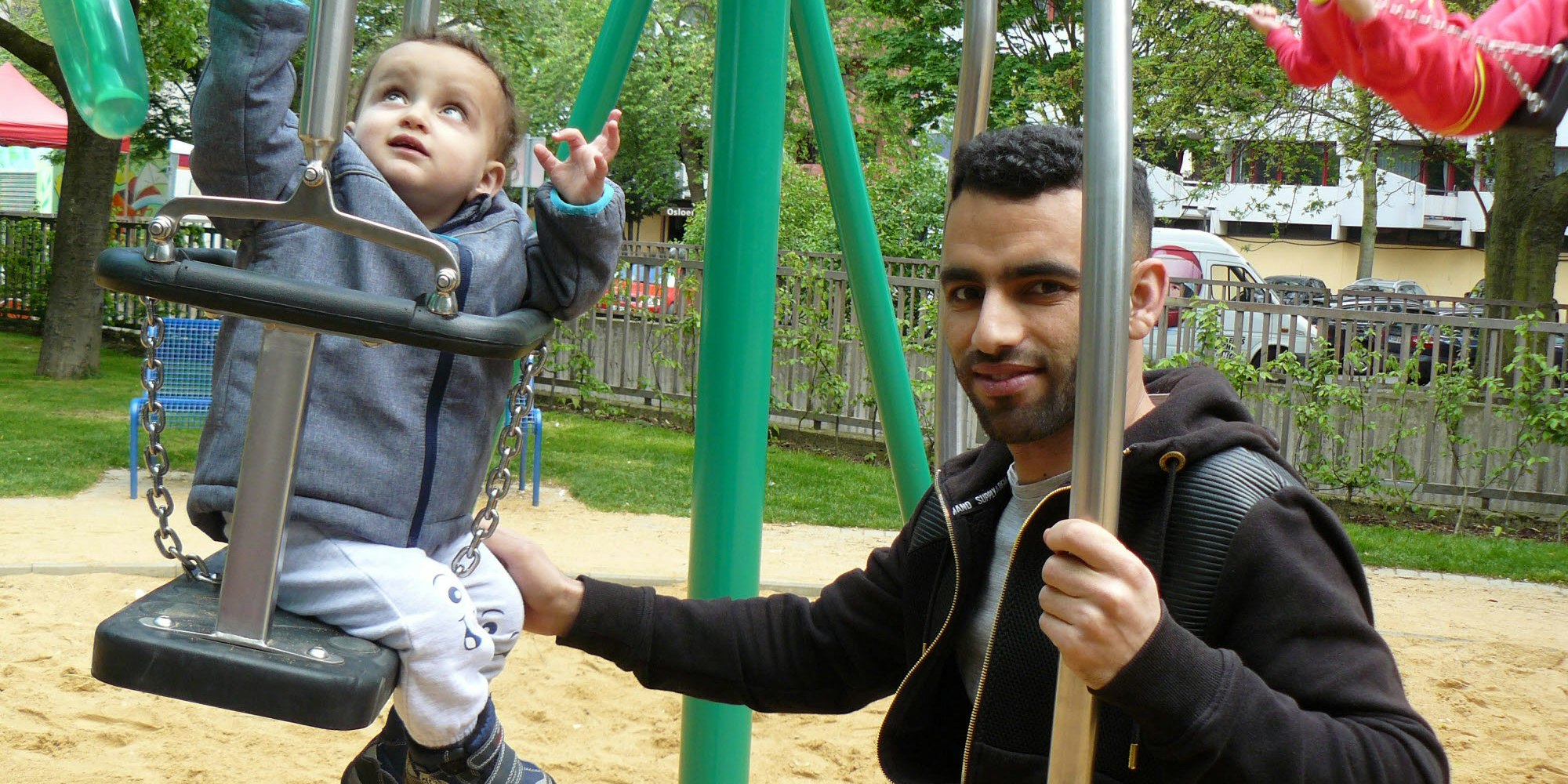 Noureddine Bouchafra und Söhnchen Yusuf-Semi testen die Partnerschaukel (Bild l.) auf dem neuen Spielplatz Osloer Straße (r.).