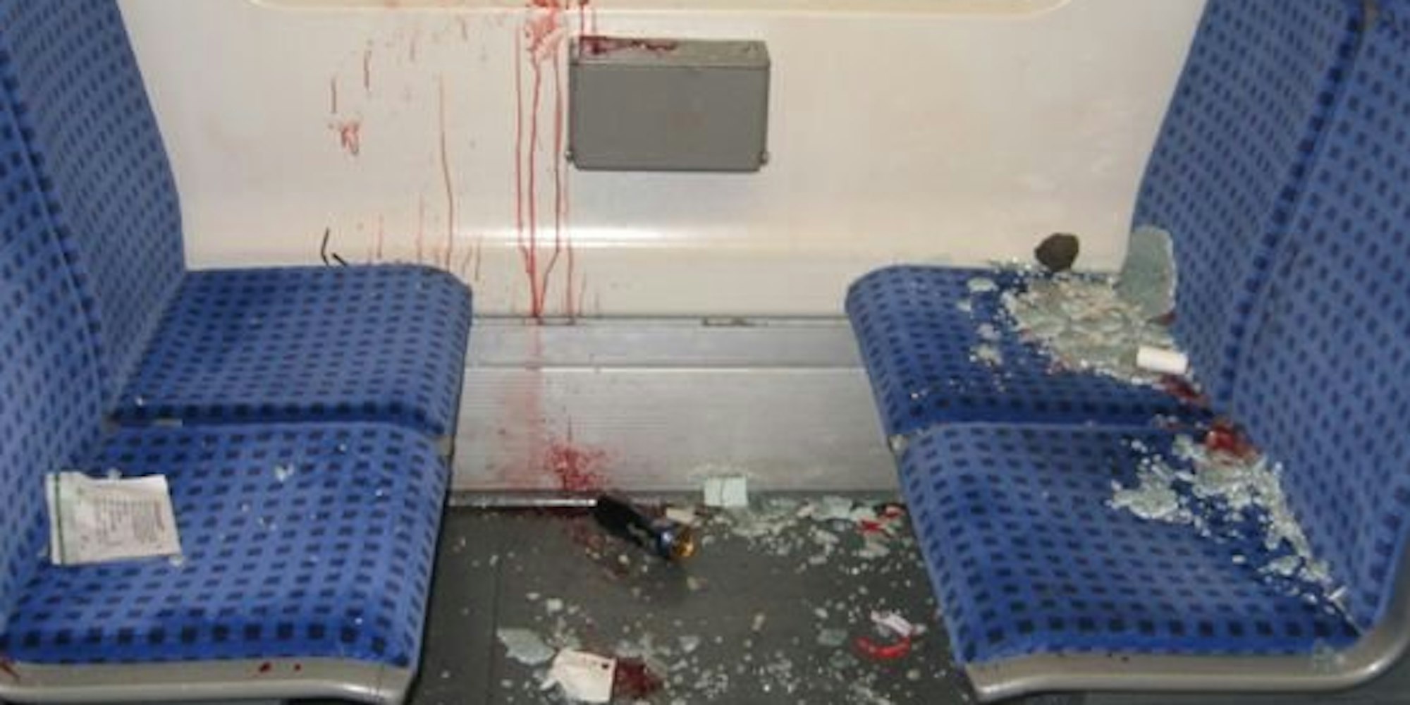 Blut und Scherben zeugen von dem Überfall in der S-Bahn, bei dem vier Männer aus Goch verletzt wurden.