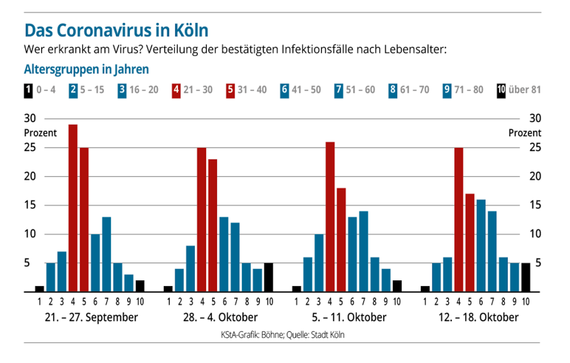 Johannes Nießen, den Leiter des Kölner Gesundheitsamtes, beunruhigt diese Entwicklung: „Natürlich macht mir das Sorge, wenn Ältere wieder mehr betroffen sind“, sagte er dem „Kölner Stadt-Anzeiger“. Andererseits habe die Stadt „aus der ersten Welle gelernt, dass es darum geht, diese Menschen besonders gut zu schützen“.