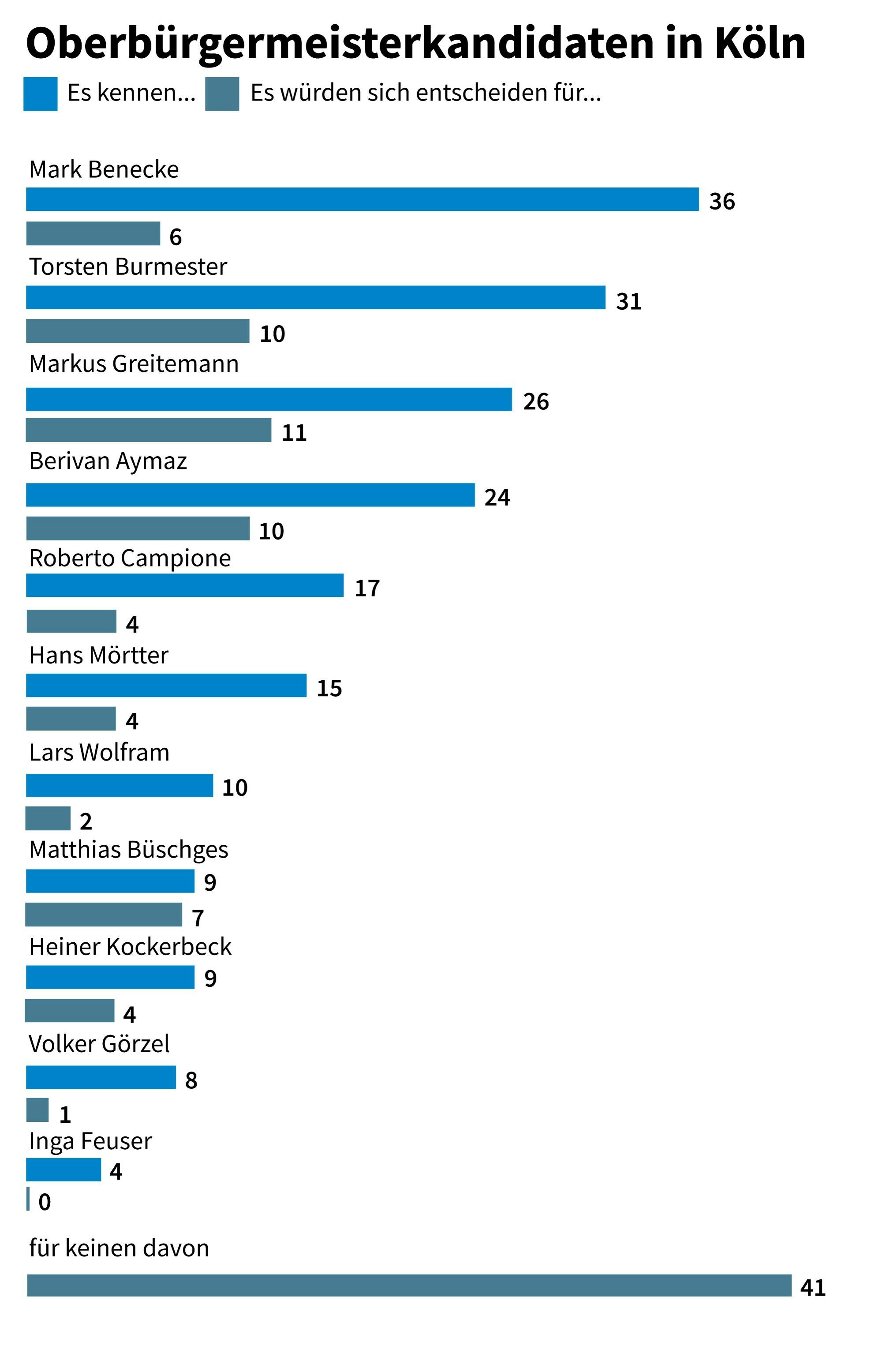 Die für kommunale Verhältnisse in einer Millionenstadt relativ hohen Bekanntheitsgrade bedeuten allerdings nicht, dass das Rennen um das Oberbürgermeisteramt bereits gelaufen ist. Ganz im Gegenteil ist der Ausgang wohl völlig offen. Elf Prozent würden demnach Markus Greitemann ihre Stimme geben, jeweils zehn Prozent Torsten Burmester und Berivan Aymaz. Dahinter folgt mit sieben Prozent Matthias Büschges für die AfD, der allerdings ausschließlich von den eigenen Anhängern Zustimmung erhält.