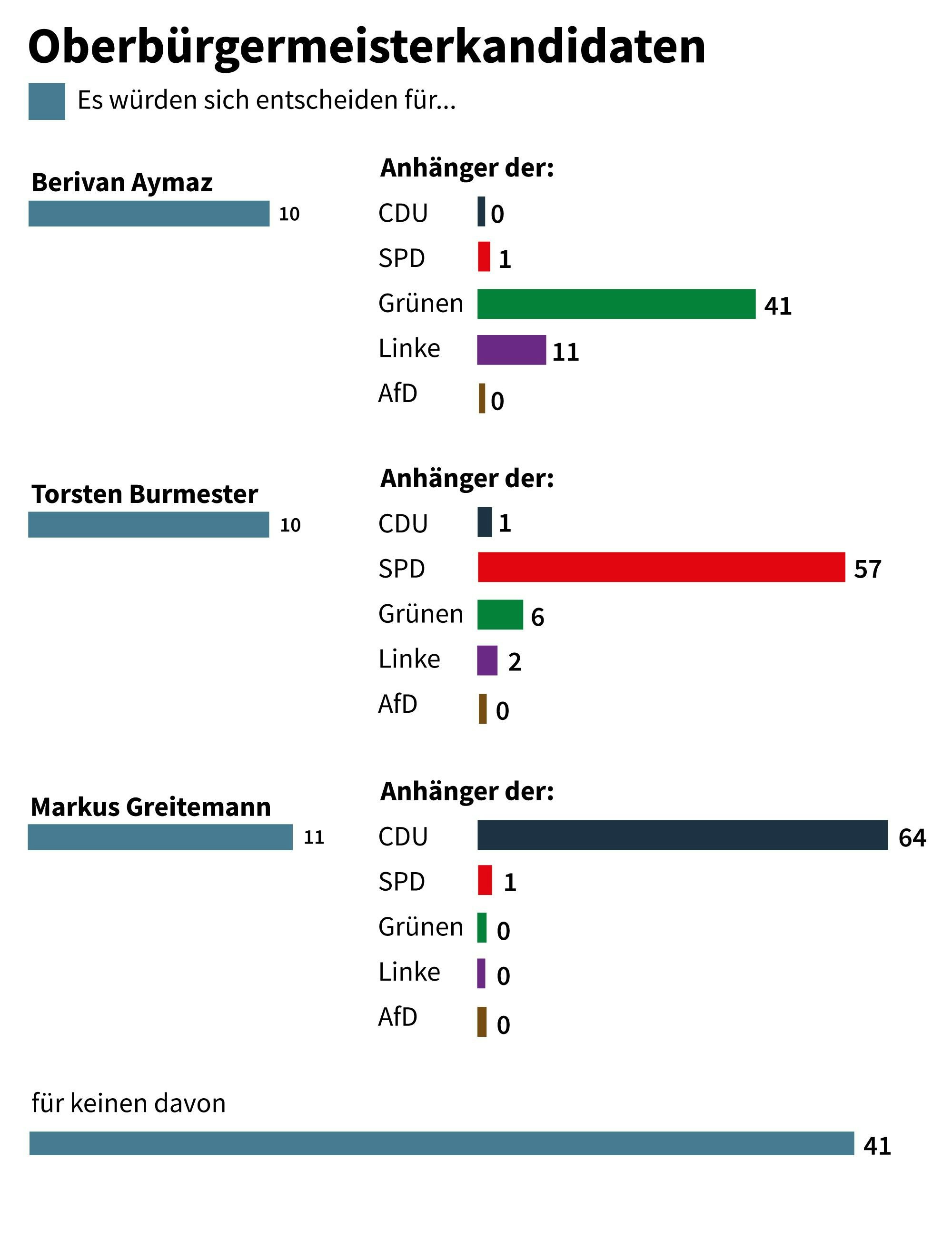 Das könnte sich vor allem für Berivan Aymaz zum Problem entwickeln. Nur 52 Prozent der Grünen-Anhänger wählen demnach meistens den Kandidaten der Partei, die sie auch bei der Wahl des Stadtrats wählen. Bei der SPD sind das hingegen 69 Prozent und bei der CDU 65 Prozent. Hinzu kommt, dass unter den Befragten nur 41 Prozent der Grünen-Anhänger Aymaz ihre Stimme geben wollen, während 64 Prozent der CDU-Anhänger Markus Greitemann und 57 Prozent der SPD-Anhänger Torsten Burmester wählen wollen. Sie genießen innerhalb der eigenen Wählerschaft also einen größeren Rückhalt als Aymaz in ihrer.