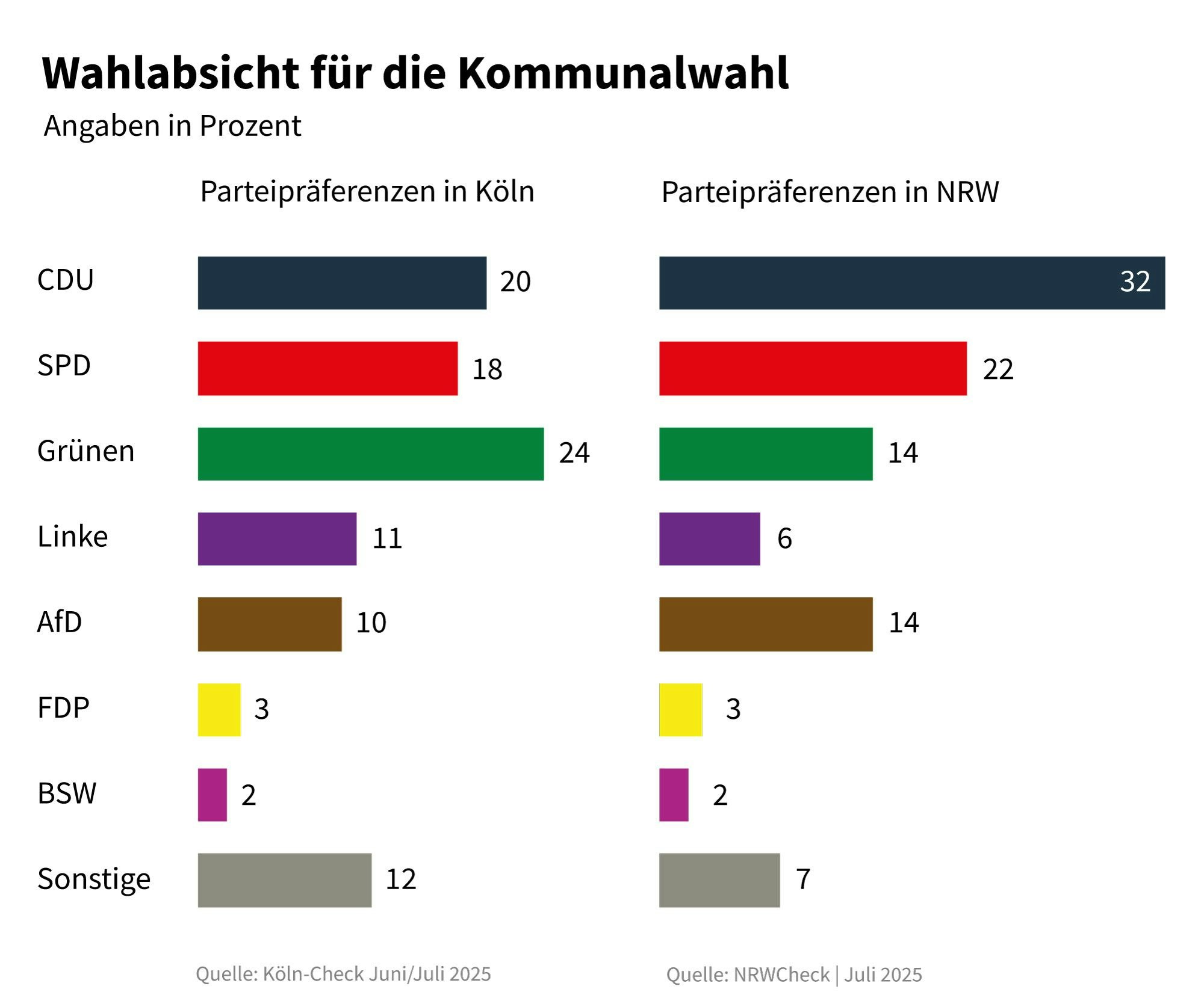 Grüne und CDU, die in Köln seit zehn Jahren das Ratsbündnis bilden, würden bei einer Landtagswahl besser abschneiden als bei der Kommunalwahl und zudem die Plätze miteinander tauschen. 27 Prozent der befragten Kölner würden im Land die CDU wählen, 25 Prozent die Grünen. Die SPD käme hingegen nur auf 14 Prozent und würde bei einer Landtagswahl somit schlechter abschneiden als auf kommunaler Ebene.