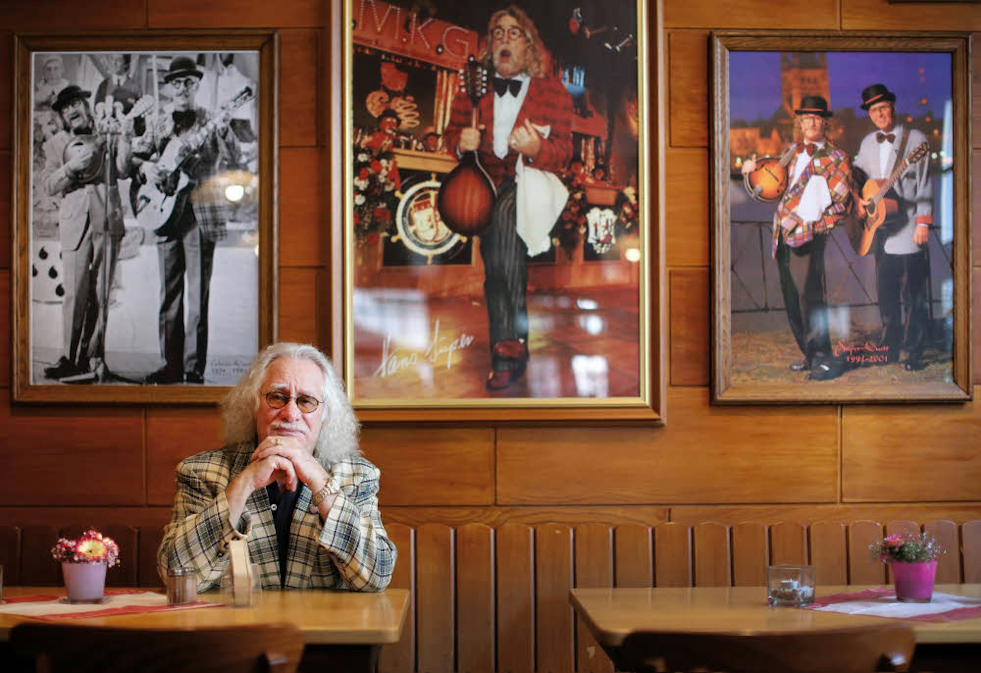Hans Süper im „Sölzer Klaaf“ vor Bilder seiner großen Karriere, links das Colonia Duett, rechts das Süper Duett. Ein Foto aus dem Jahr 2016.
