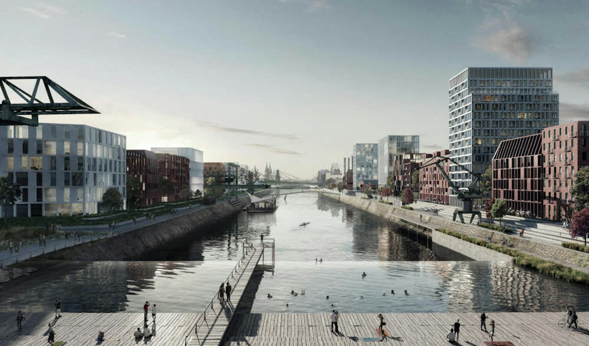 Am Südenende des Deutzer Hafens könnte eine Art Pool entstehen. (Visualisierung)