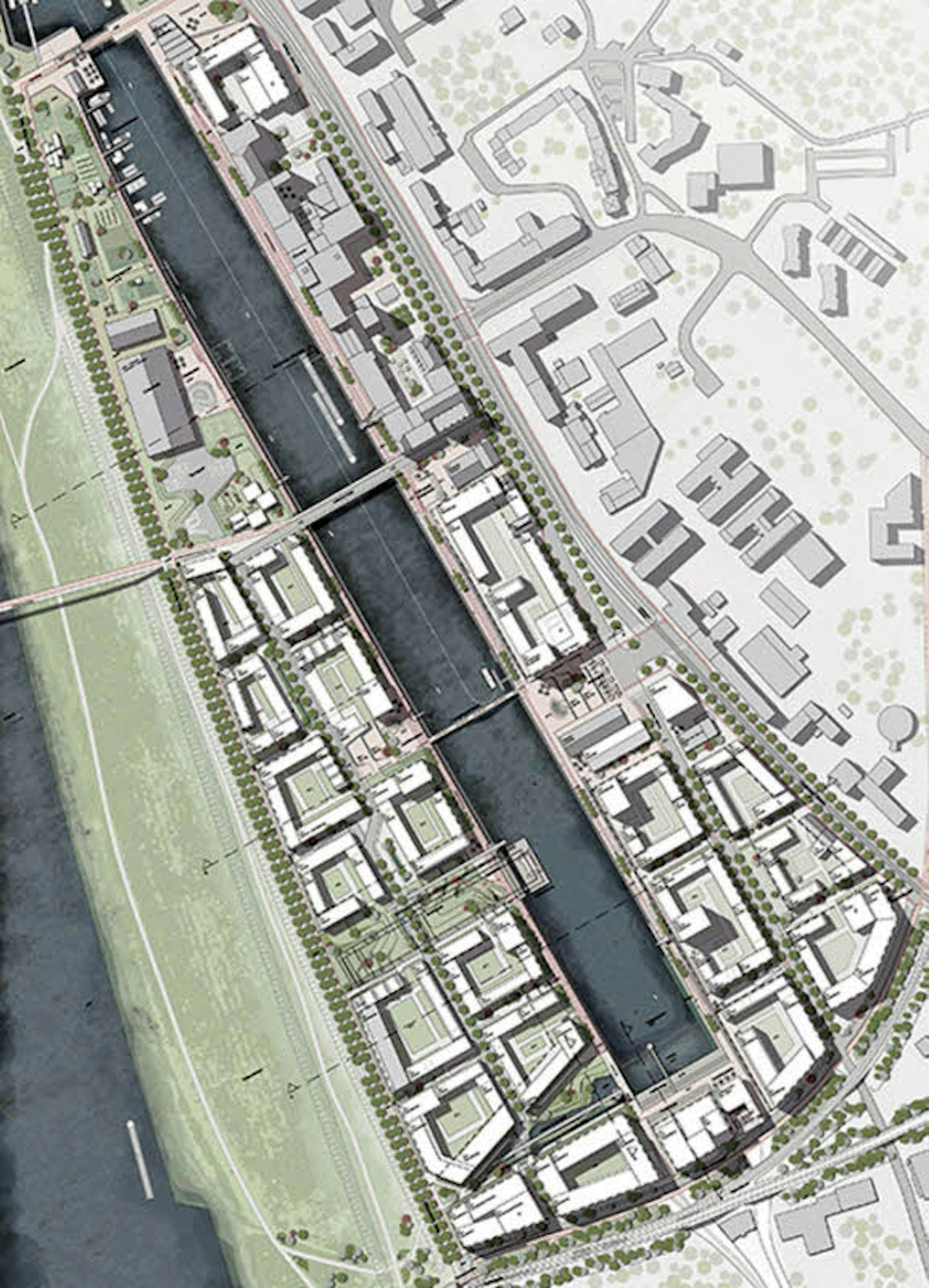 Die Stadt begründet ihre Entscheidung für eine städtebauliche Entwicklungsmaßnahme mit „einem hohen öffentlichen Interesse“ aufgrund eines erheblichen Bedarfs an Wohn- und Arbeitsstätten, der Bedeutung des Projektes für die Stadtentwicklung sowie der umfangreichen finanziellen Vorleistungen. So hat das Baudezernat bereits eine Planung ausarbeiten lassen, auf deren Grundlage das Hafengebiet umgestaltet werden soll. Das dänische Architekturbüro Cobe aus Kopenhagen erstellte dafür ein Konzept und setzte sich in einem Wettbewerb gegen andere Büros durch.