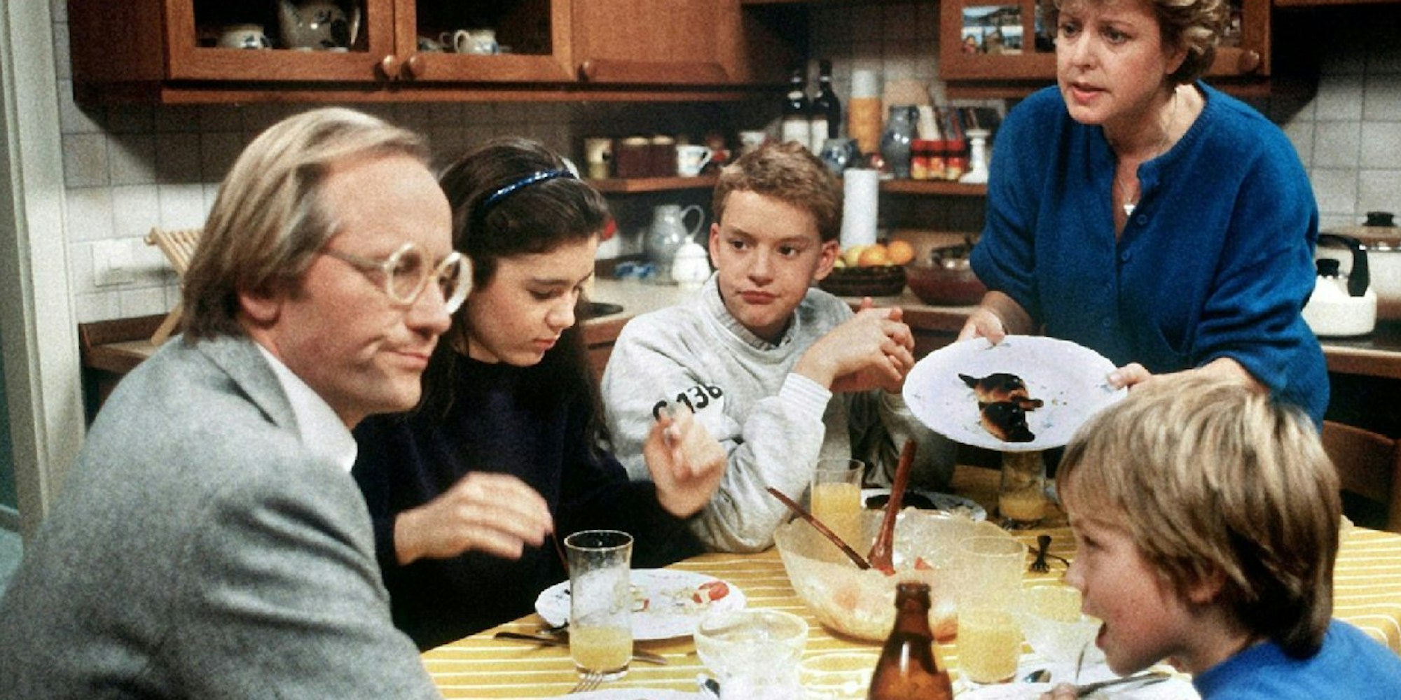 Helga Beimer (Marie-Luise Marjan, hinten r.) mit ihrem ersten Mann Hans (Joachim Hermann Luger, l.) und ihren Kindern (v. l. n. r.) Marion (Ina Bleiweiß), Benny (Christian Kahrmann) und Klausi (Moritz A. Sachs) in einer Szene der „Lindenstraße“ aus dem Jahr 1986