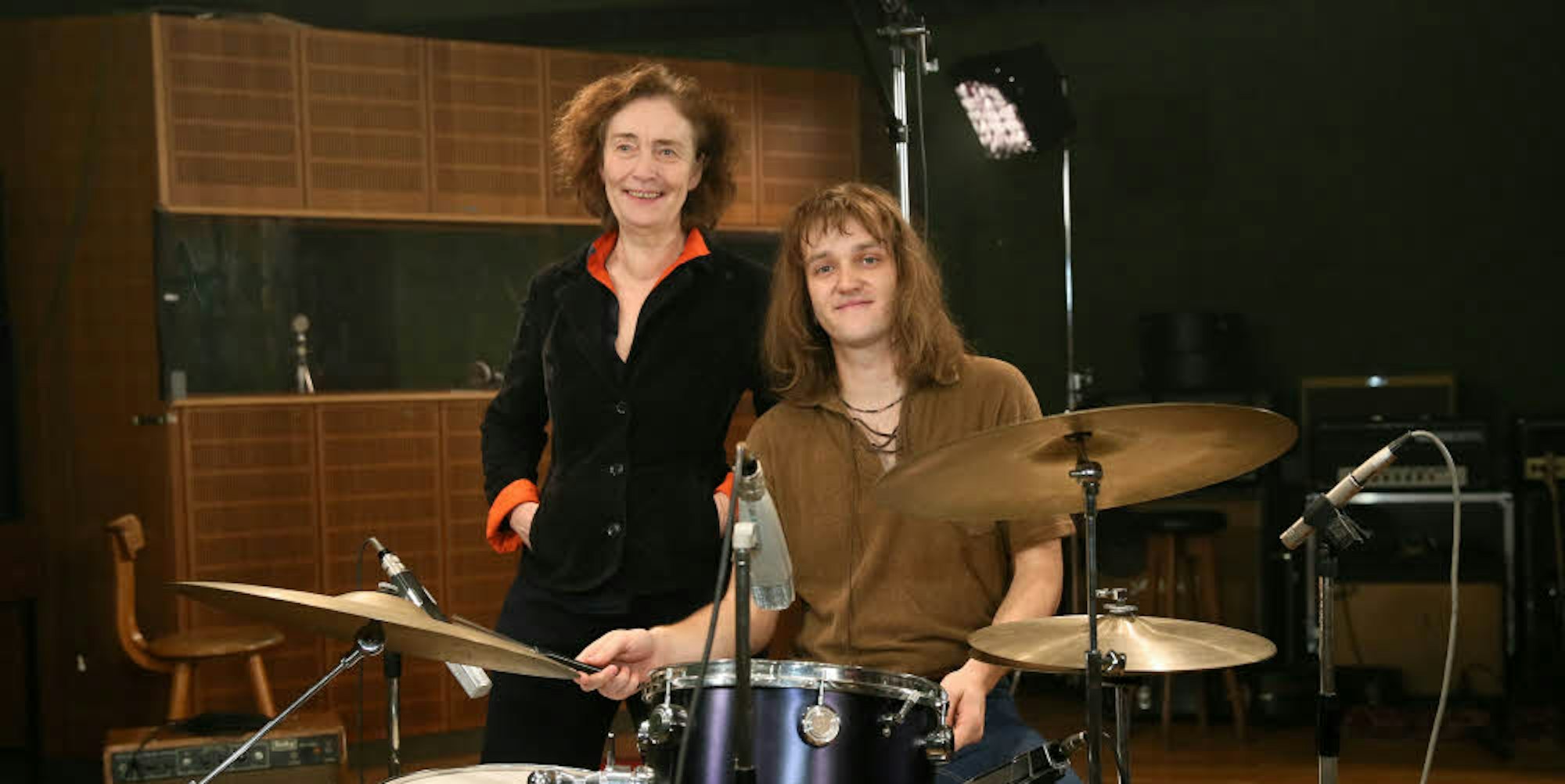 Regisseurin Hermine Huntgeburth und Jan Bülow, der den jungen Lindenberg spielt, in den Maarweg-Studios