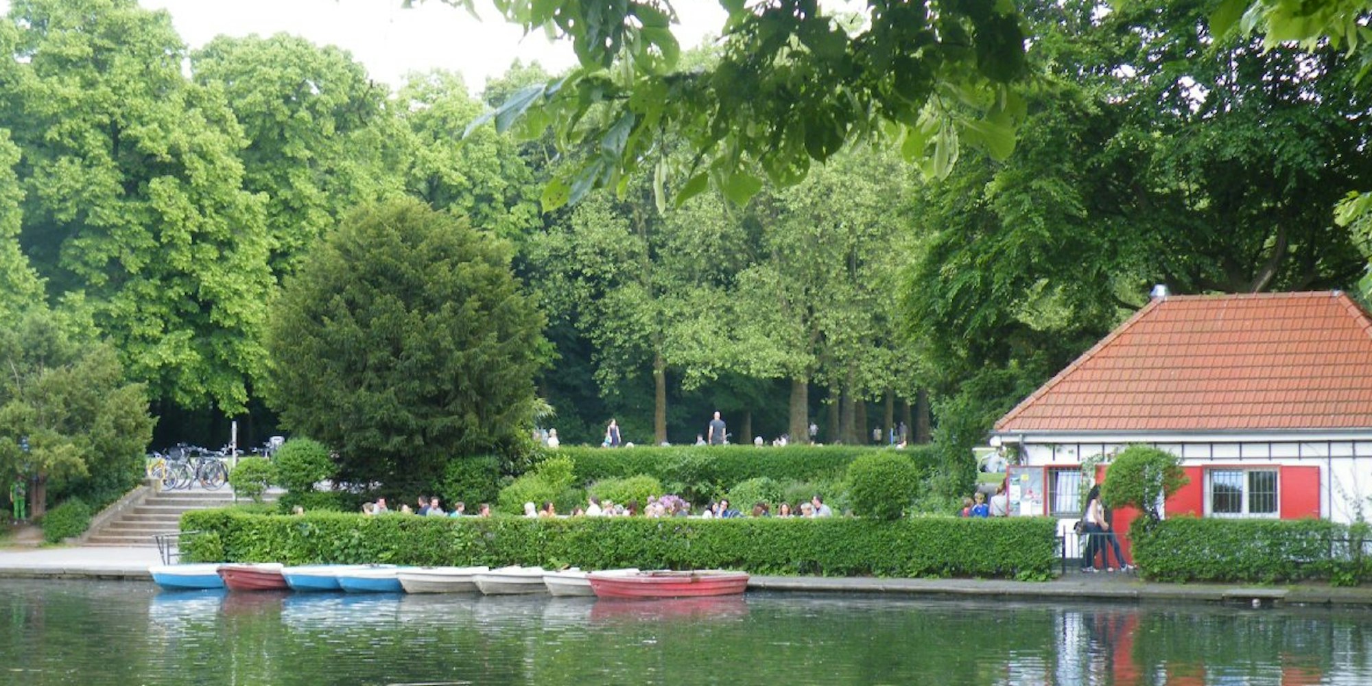 Blick auf den Kahnweiher im Blücherpark. Der Kiosk bietet neben einem Paddelboot-Verleih Getränke, Kaffee und Kuchen, sowie warme Gerichte von der Tageskarte. An den Sommer-Wochenenden finden hier auch Partys statt.