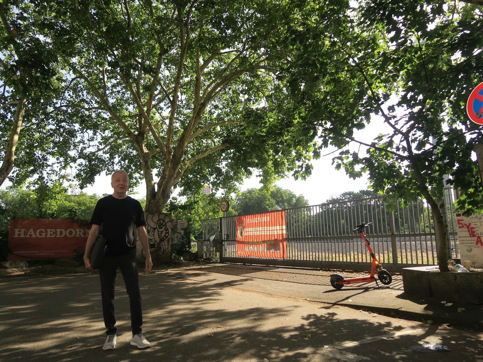Die beiden Männer in den schwarzen T-Shirts sind wegen des zweitägigen Amphi-Festivals in Köln und übernachten im Weltempfänger Hostel an der Ecke Venloer Straße/Franz-Geuer-Straße. So eine Festival-Nacht kann anstrengend sein, deshalb erholen sie sich an diesem sonnigen Morgen bei Kaffee und Zigaretten im Schatten einer mächtigen Platane in der Franz-Geuer-Straße, Stühle stehen dort bereit. „Das machen wir jedes Jahr hier, wir kommen ja regelmäßig zum Festival“, erzählt der erste. „Hoffentlich finden Sie die Platane im kommenden Jahr noch vor, die soll nämlich gefällt werden“, sagt Jürgen Lauppe.