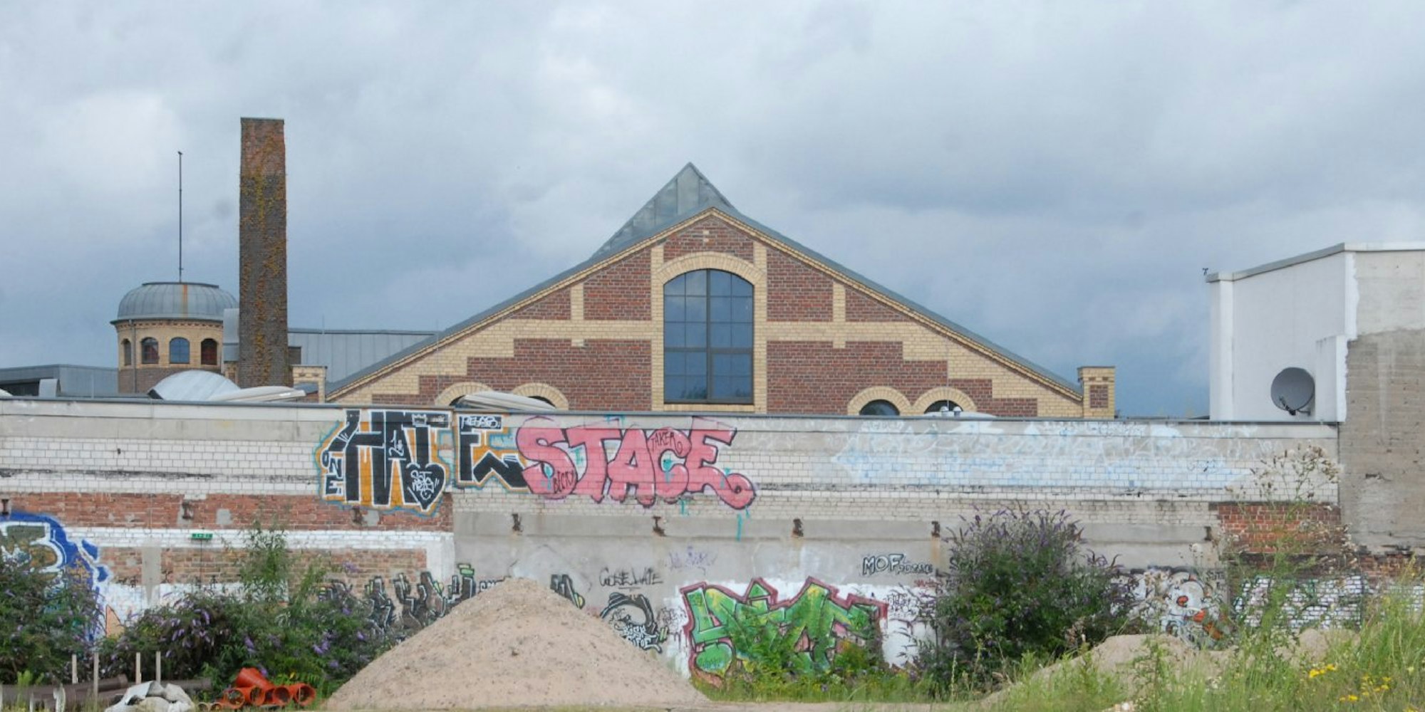 Hinter der Grenzmauer sind die Gebäude der früheren „Vulkan“-Fabrik zu erkennen.
