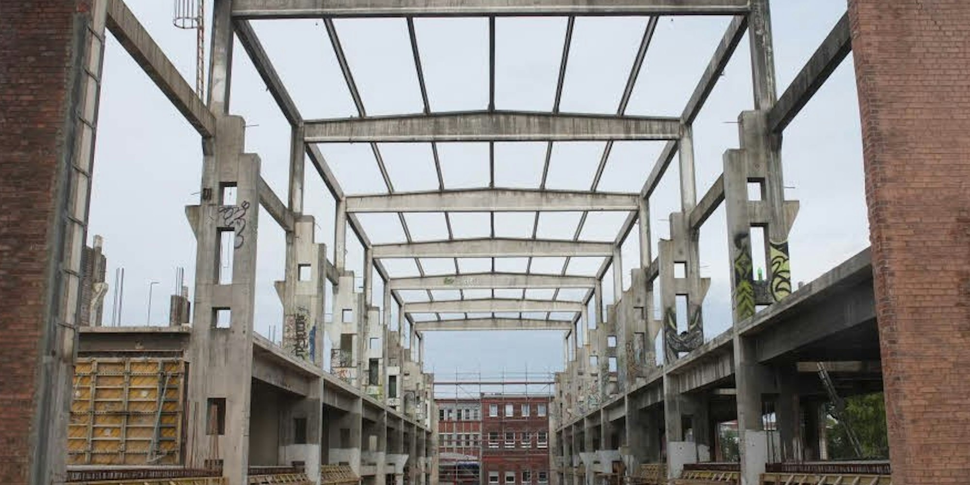 Neue Etagen erhält die alte Halle, die aus Fertigbauteilen besteht.