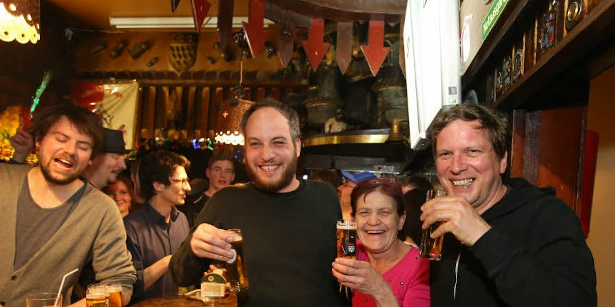 Im Bergkrug baumeln Karnevalsorden von der Lampe, auf den wuchtigen Holztischen stehen Osterglocken in weißen Vasen. Urlaubsgrüße der Stammgäste hängen am Schrank – Postkarten aus Paris, Mallorca und dem Schwarzwald. Ein paar Tische und Stühle mussten der improvisierten Tanzfläche weichen. Ansonsten bleibt alles, wie es schon immer war. „Das ist das Konzept“, sagt Preuten. „Wir wollen die Kneipen nicht verändern.“ Das zeigt auch die Getränkekarte. Szenegetränke sucht man hier vergebens. Zum Kölsch kommen Eigenkreationen wie „Kornpirinha“ und „Wacholder Tonic mit Gurke“. Und als die Gäste gegen Mitternacht hungrig werden, bringt Aggi Quirnbach Frikadellen und eine Tube Senf. Die Wirtin und einige Stammgäste feiern mit. „Ich finde es herrlich, dass die jungen Leute hier sind“, sagt die 56-Jährige. „Da sind so viele Nette dabei, man kann nicht immer alle über einen Kamm scheren.“ Dass die Partys so gut ankommen, liegt auch an der Musik, die die Veranstalter als „Bierpogopop und Pathos“ bezeichnen und die „irgendwo zwischen der Powerballade der 80er Jahre und Punkrock“ liegt, wie Essex sagt. „Wichtig ist, es muss in die Kneipe passen.“ In den Bergkrug passt Nino de Angelo genauso gut wie New Order. Aggi Quirnbach tanzt immer weiter, bis ihre Tochter Jessica hinter dem Tresen schreit: „Wir haben keine Kölschgläser mehr!“ Also geht Aggi spülen und lächelt. Es ist schon eine ganze Weile her, dass im Bergkrug die Gläser knapp wurden.