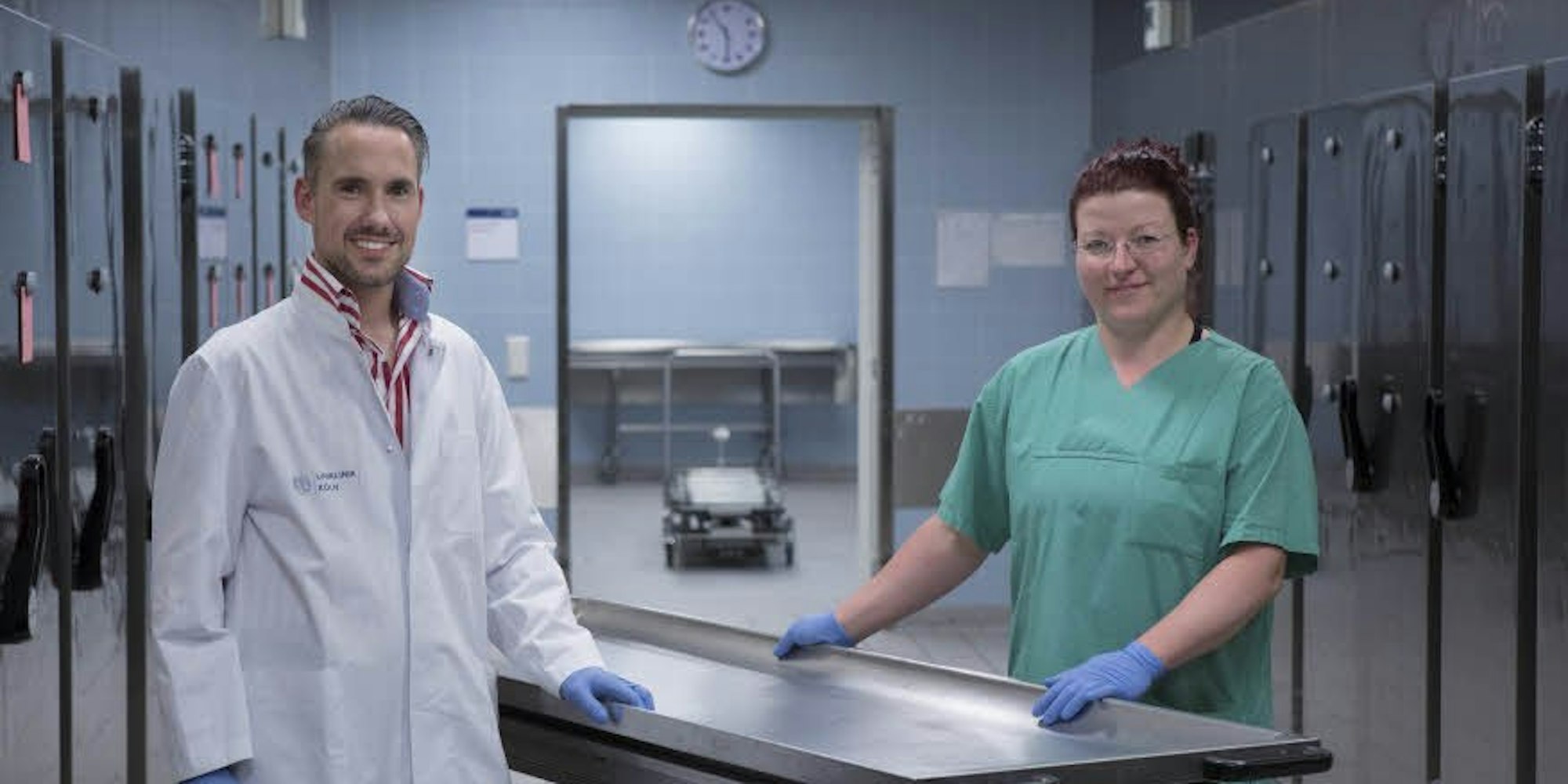 In der Kühlkammer des benachbarten Instituts für Rechtsmedizin am Melatengürtel wird ein Leichnam in weißer Plastikhülle angeliefert. „Was für ein Brocken“, sagt ein Bestatter. Sein Kompagnon antwortet mit einem Girren. An den silbern glänzenden Kühlzellen hängen rosafarben die Zettel mit Namen und Gewicht der Verstorbenen. Eine Fliegenklatsche baumelt an einem rollbaren Metalltisch. „Seit ich hier arbeite, verbinde ich mit Fliegen etwas anderes als vorher“, sagt Rechtsmediziner Thomas Kamphausen, und begrüßt mit einem lustigen Spruch Denise Pönisch, die als Sektions- und Präparationsassistentin Dienst tut und soeben eine Leiche in einer Kühlzelle verstaut hat.