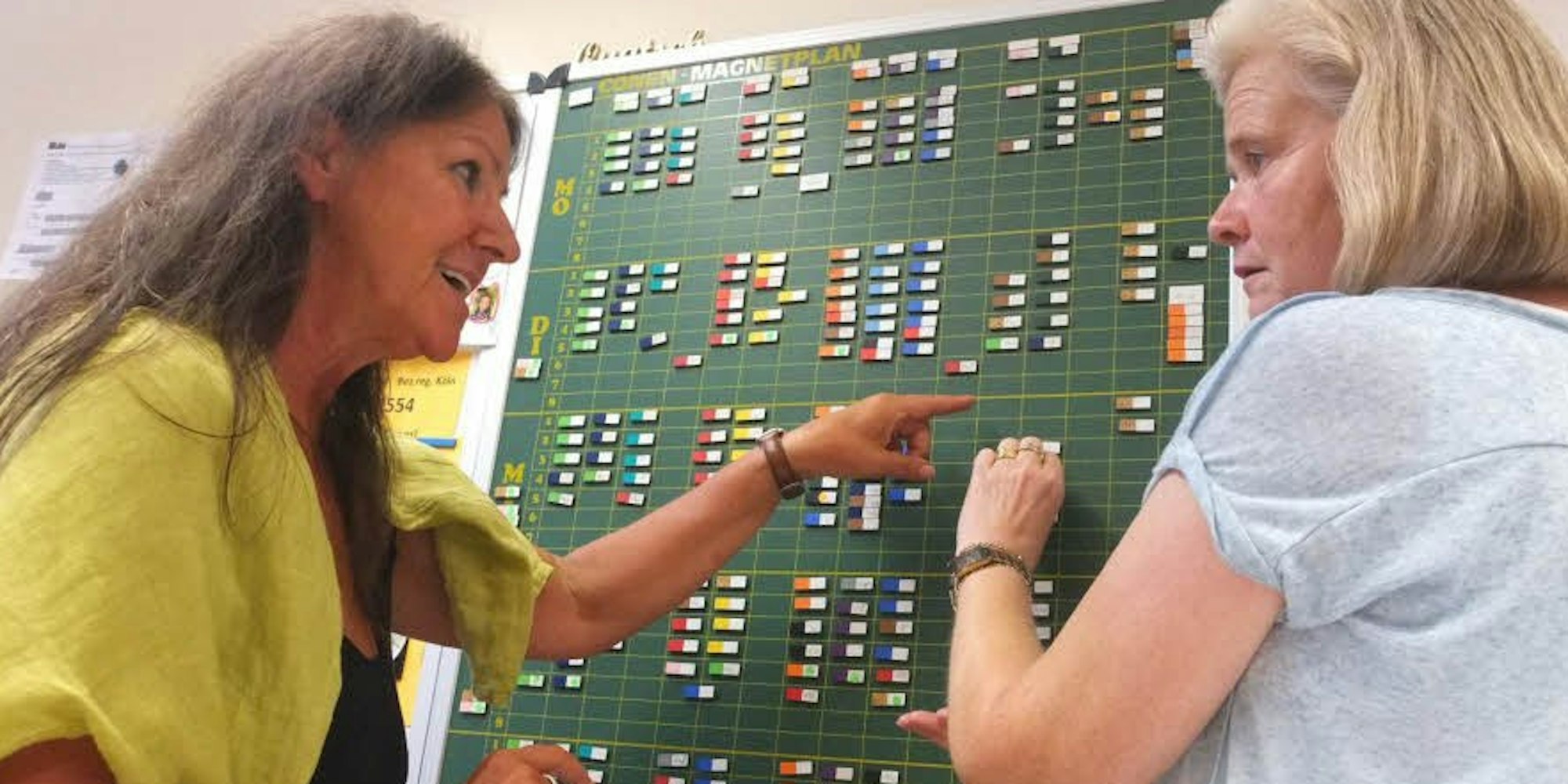 Alice Seim(L) und Uta Schlömer besprechen den Stundenplan.