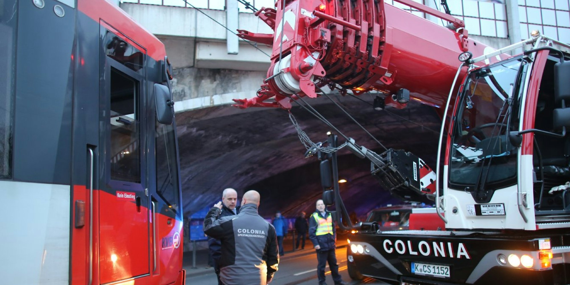 Unfall in Köln-EhrenfeldKranwagen kollidiert mit KVB-Bahn