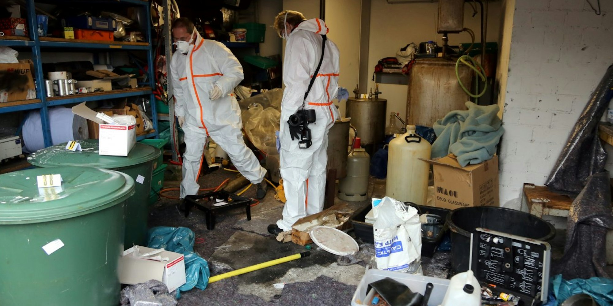 Auch am Dienstag arbeiteten Ermittler mit Masken und Schutzanzügen auf dem Gelände und sicherten Beweismittel. Ein ätzender Geruch lag in der Luft. Die anfängliche Vermutung der Polizei, dass der Verdächtige womöglich auch in seiner Wohnung in Hürth ein Labor eingerichtet haben könnte, bestätigte sich nicht.