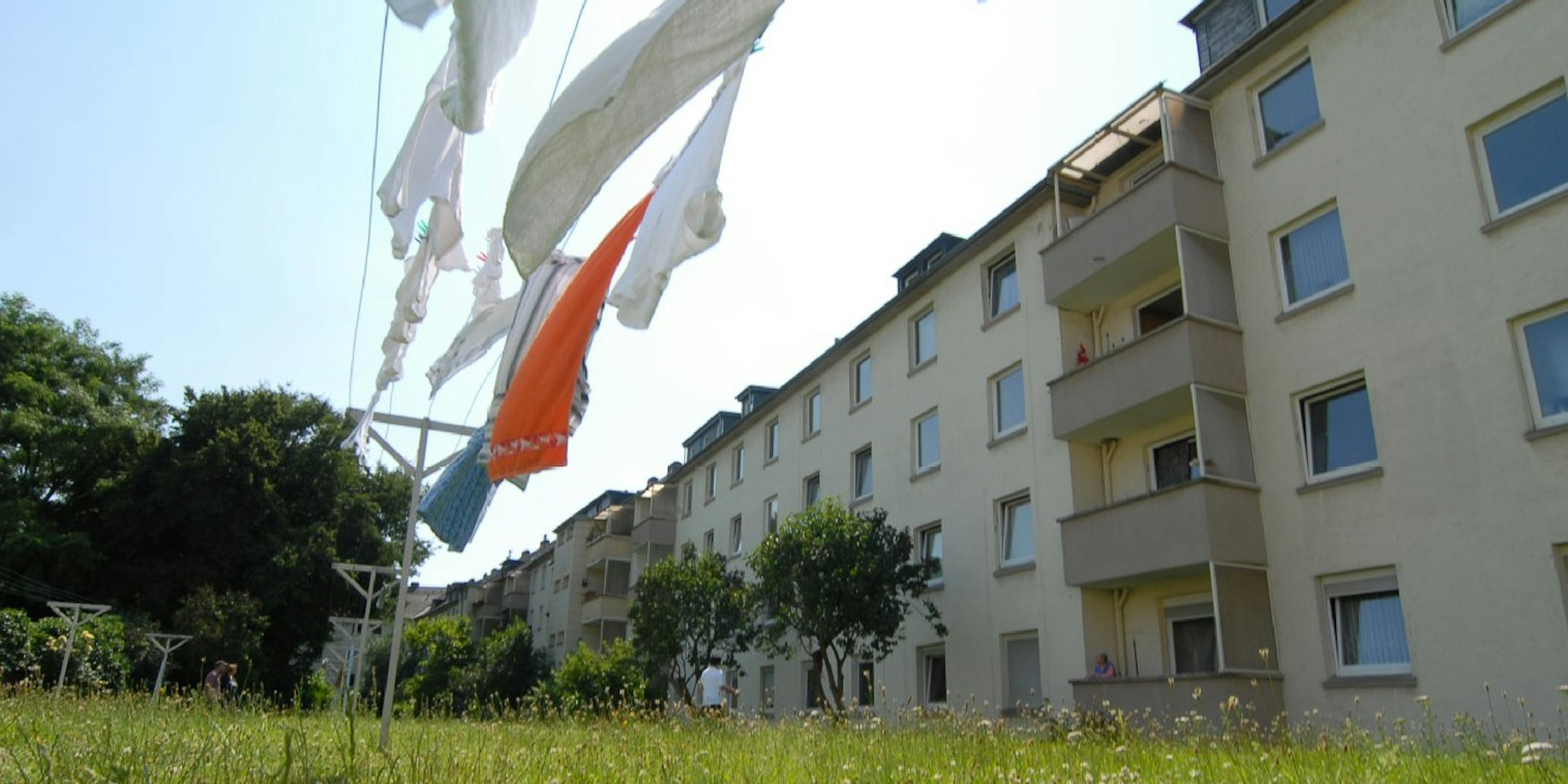 Ein typischer Genossenschaftsgarten: Hinter dem Wohngebäude liegt eine Wiese mit Wäscheleinen.