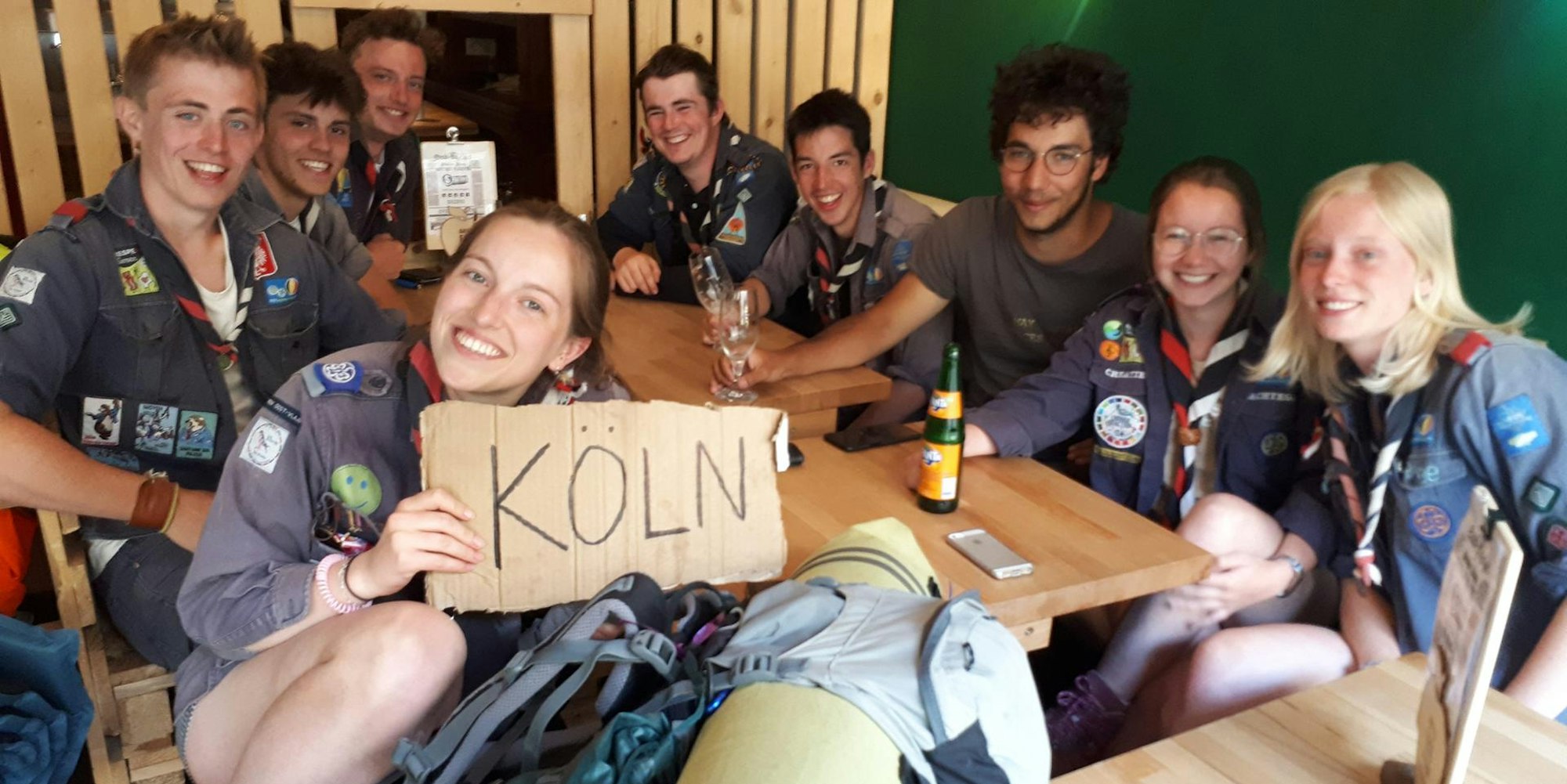 Die Pfadfinder-Truppe aus Südbelgien ist per Anhalter in drei Dreierteams nach Köln gekommen und feiert die Ankunft.