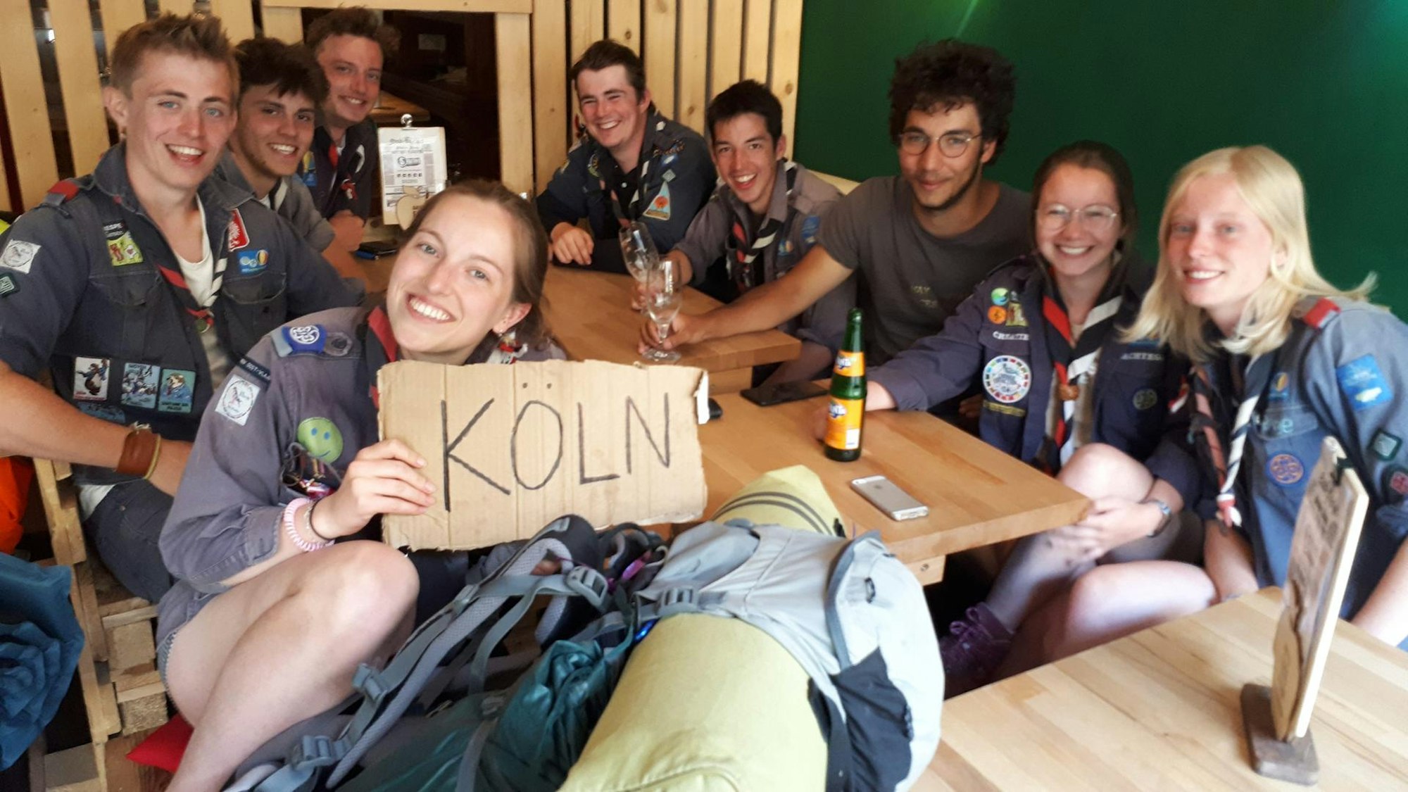 Gerade entern neun Pfadfinder aus Belgien mit Rucksäcken das „Station“. Fröhlich halten sie wie eine Trophäe ihr Pappschild „Köln“ in die Höhe. Sie sind in drei Kleingruppen von Belgien über Luxemburg bis nach Köln getrampt. Die Technik ist, wie sie erzählen, die gleiche geblieben wie früher: Immer zwei Jungs und ein Mädel bilden Teams und postieren sich an unterschiedlichen Stellen. „Das Mädel hält den Daumen hoch. Erst, wenn der Fahrer anhält, kommen wir beiden Jungs aus der Deckung“, erzählt Peter lachend.