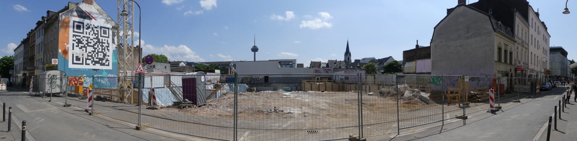 Panoramablick auf die Baulücke mit dem beschädigten Haus an ihrem rechten Rand.