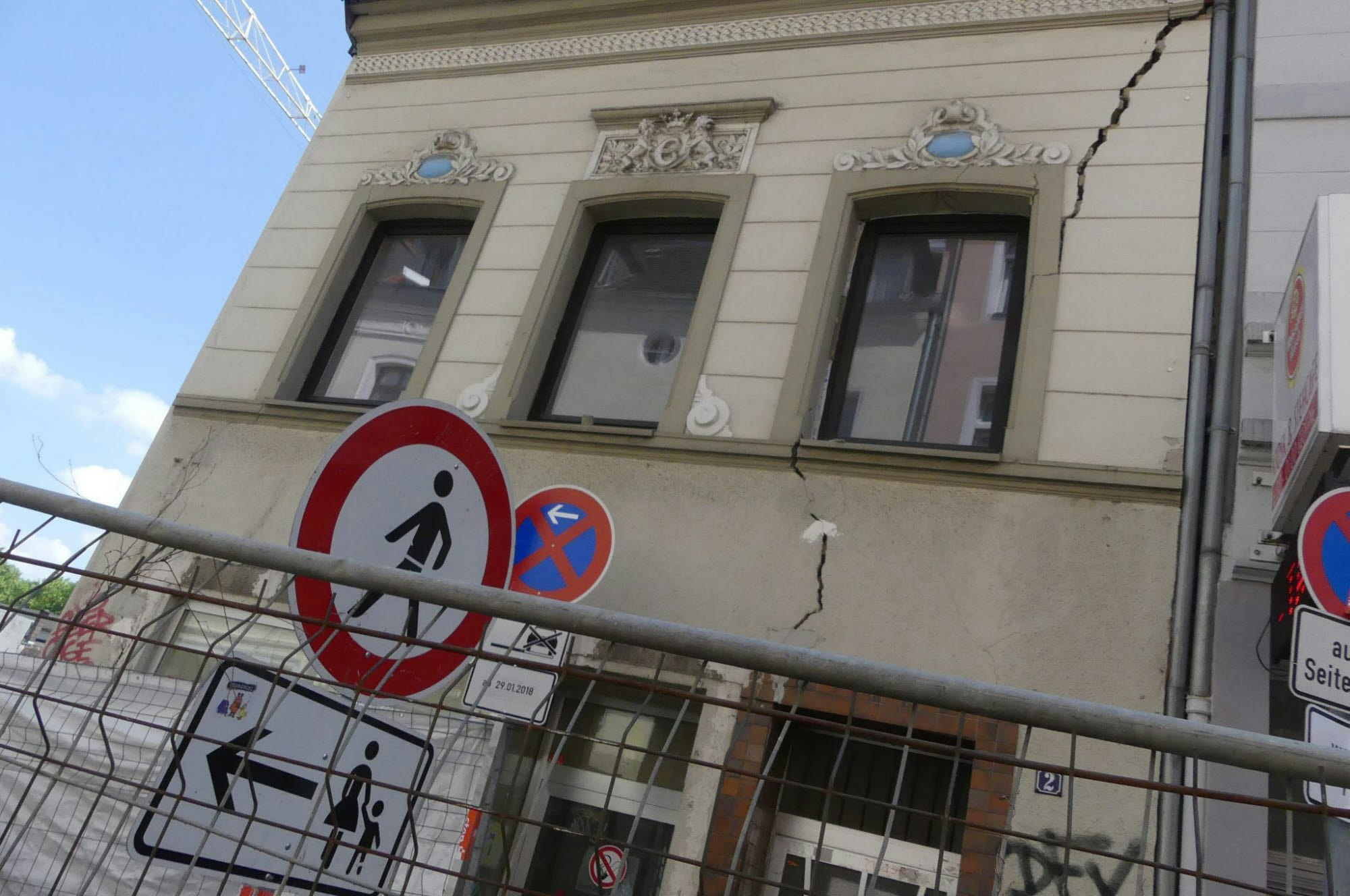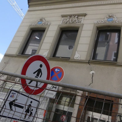 Wegen der Baugrube auf dem Nachbargrundstück sollte das Gebäude mit mehreren Betonriegeln unterfangen werden. Ausgerechnet während dieser Arbeiten gab der Gewölbekeller ein Stück nach. Menschen befanden sich zu diesem Zeitpunkt zum Glück nicht im Gebäude. Die Bauaufsicht sprach ein Betretungsverbot aus.