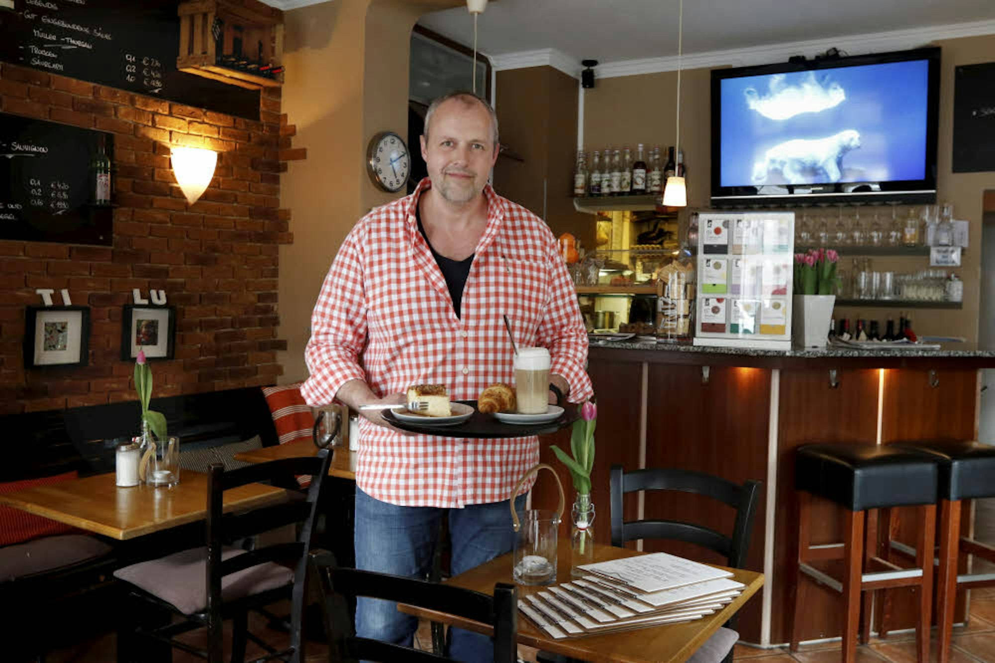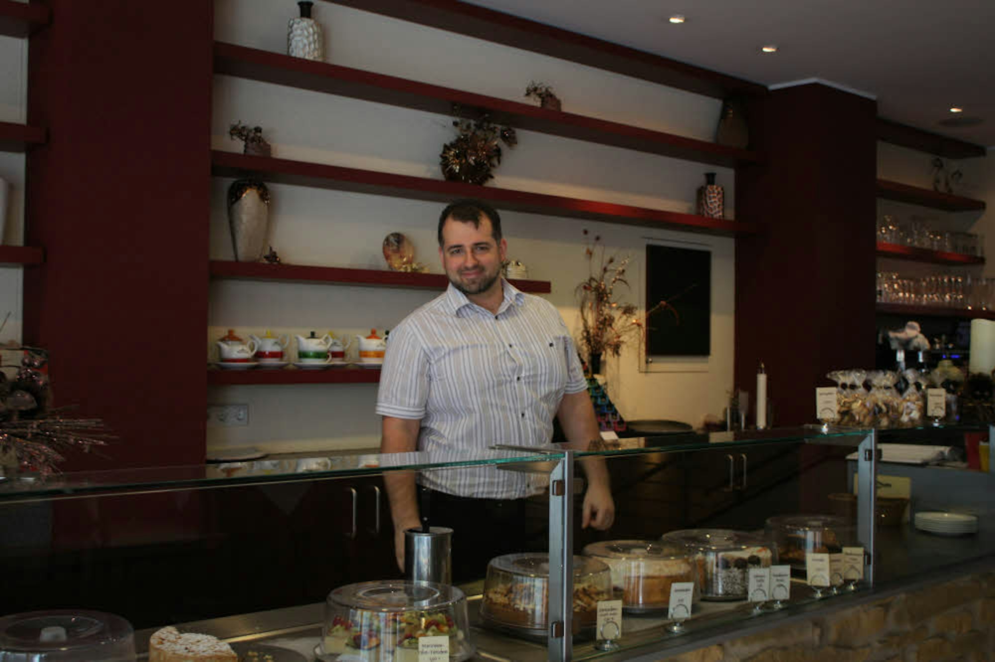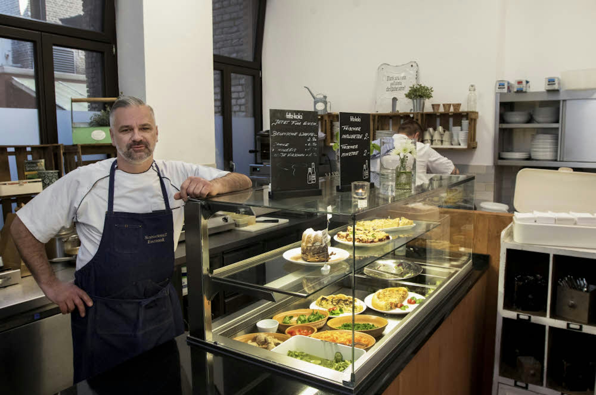 Im Café Saint Louis serviert Sascha Manz aber nicht nur selbstgemischte Salate, Bagels und täglich wechselnde Suppen, sondern auch Kuchen und Kaffee aus Köln. Im Fragebogen steht er Rede und Antwort.