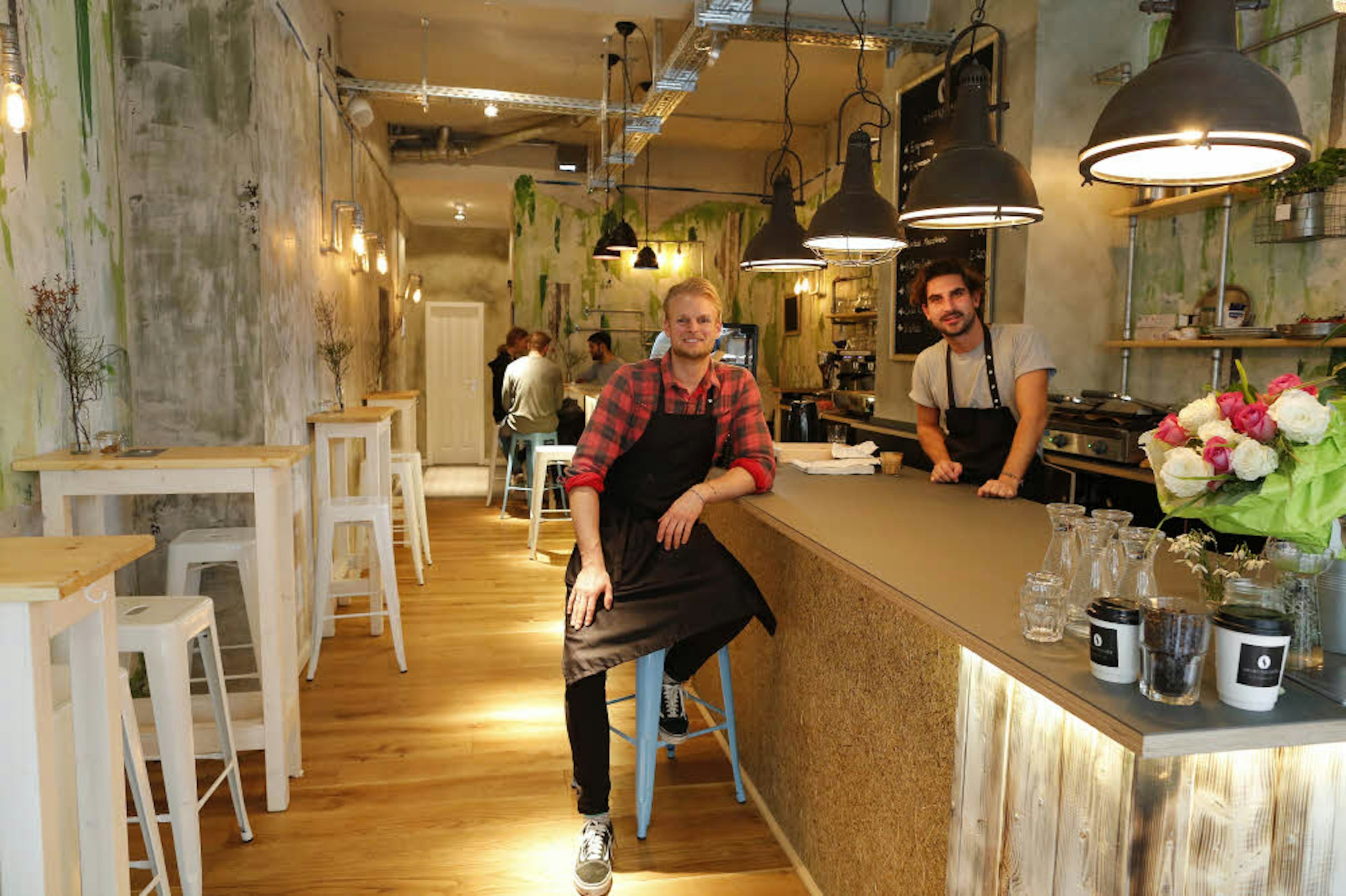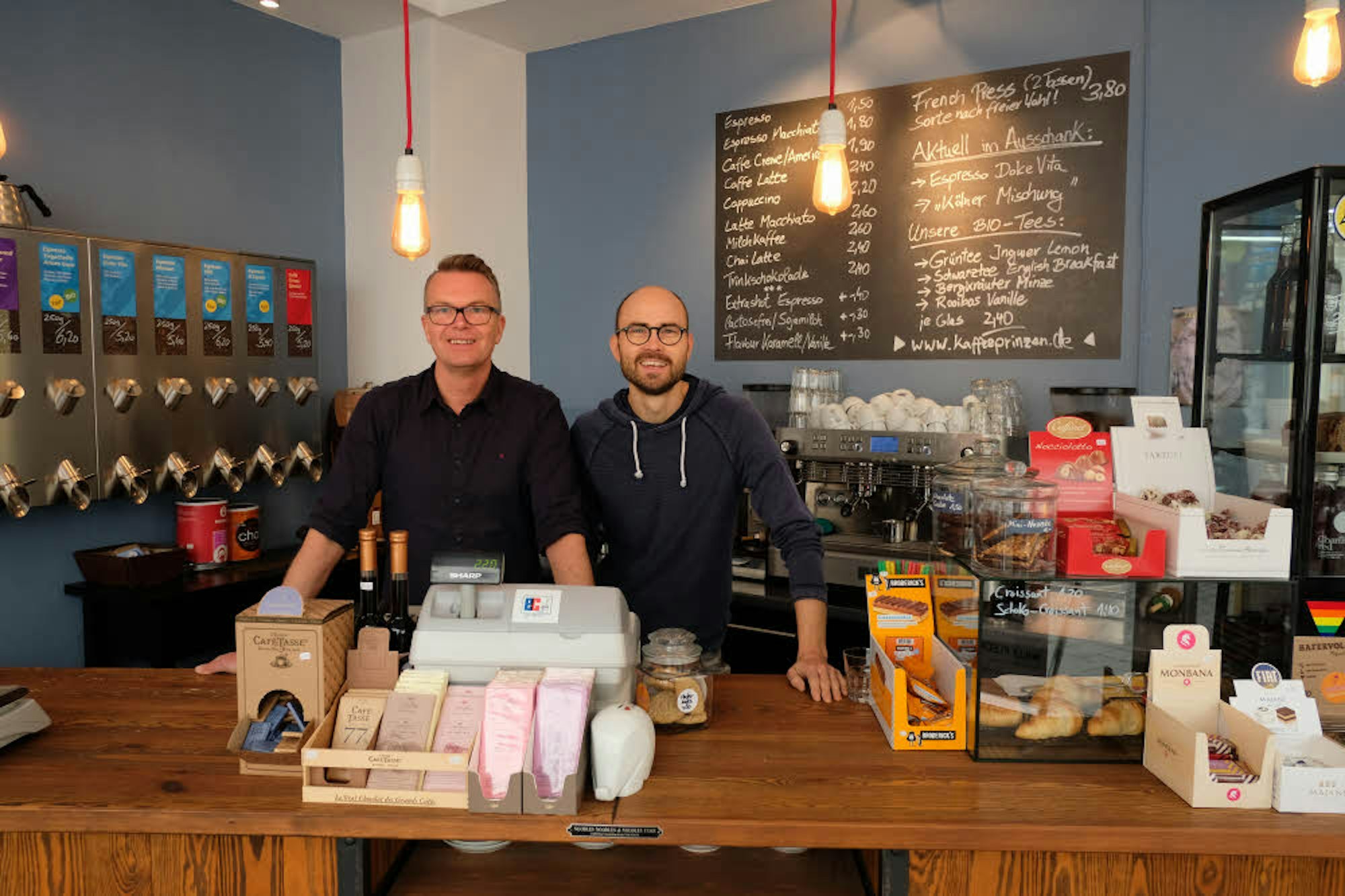 Inhaber Tim Stutzenstein (links) mit Mitarbeiter Pascal Peljord im Kaffeehaus Severinstraße.