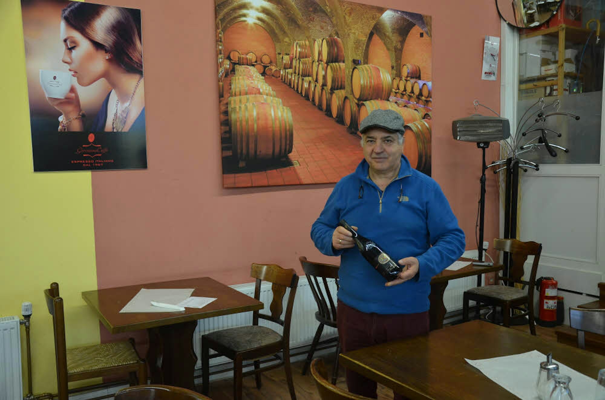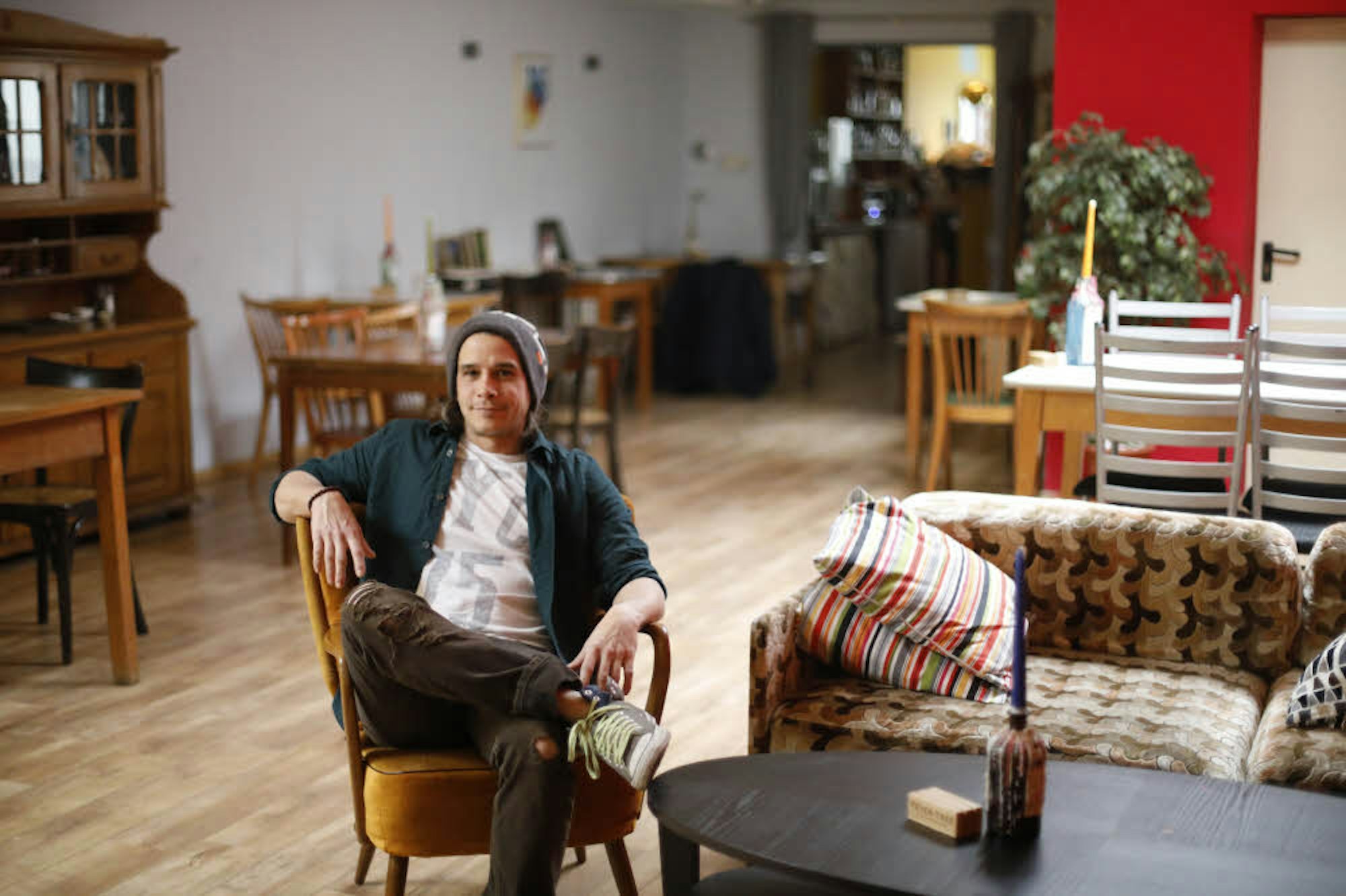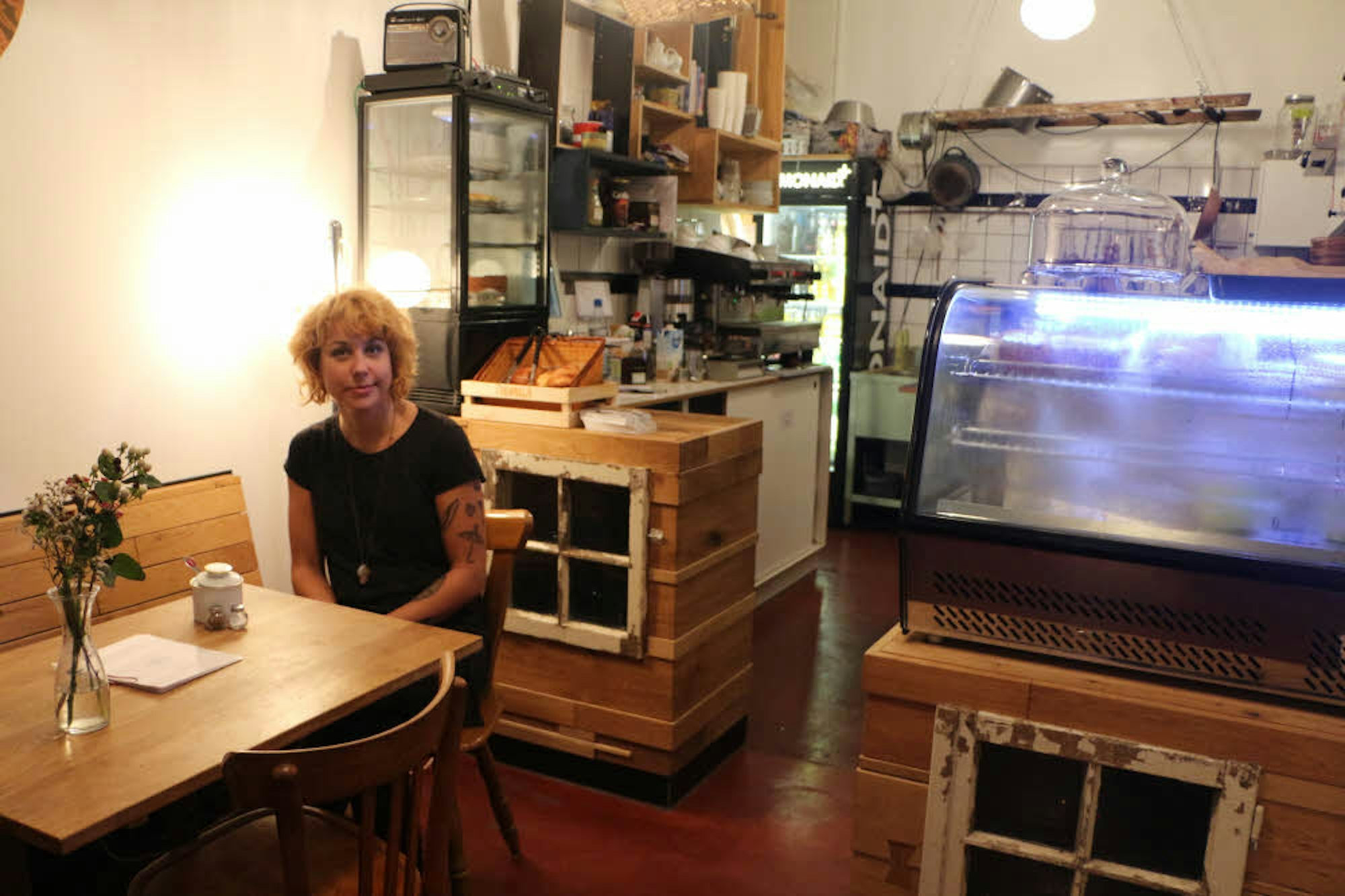 Alle Tische im Café habe ich selbst geschreinert. Außerdem haben wir zwei offene Kamine, an denen man sich an kalten Tagen wärmen kann.