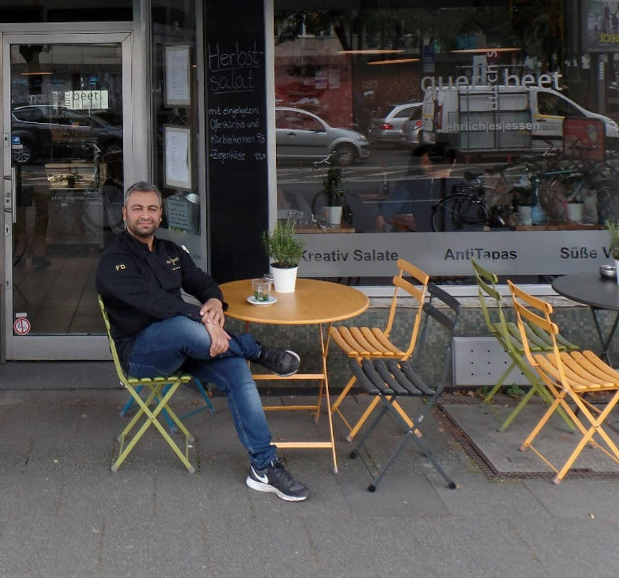 Wir sind die einzige Salatbar rechtsrheinisch, die neben den normalen Supermärkten viele vegane Angebote hat. Im Sommer außerdem: Außenplätze in der Sonne, hier auf der Deutzer Freiheit eine kleine Seltenheit.